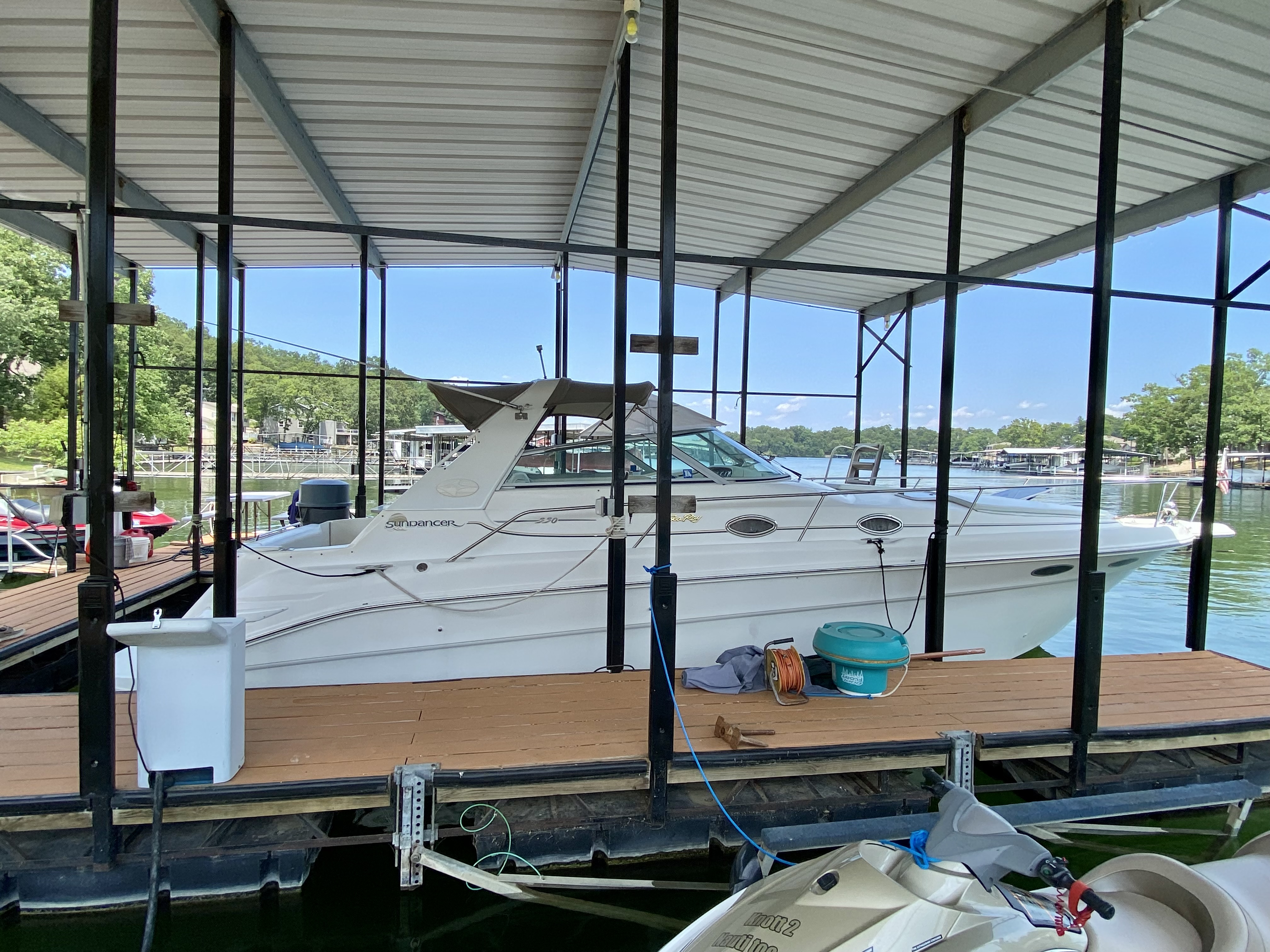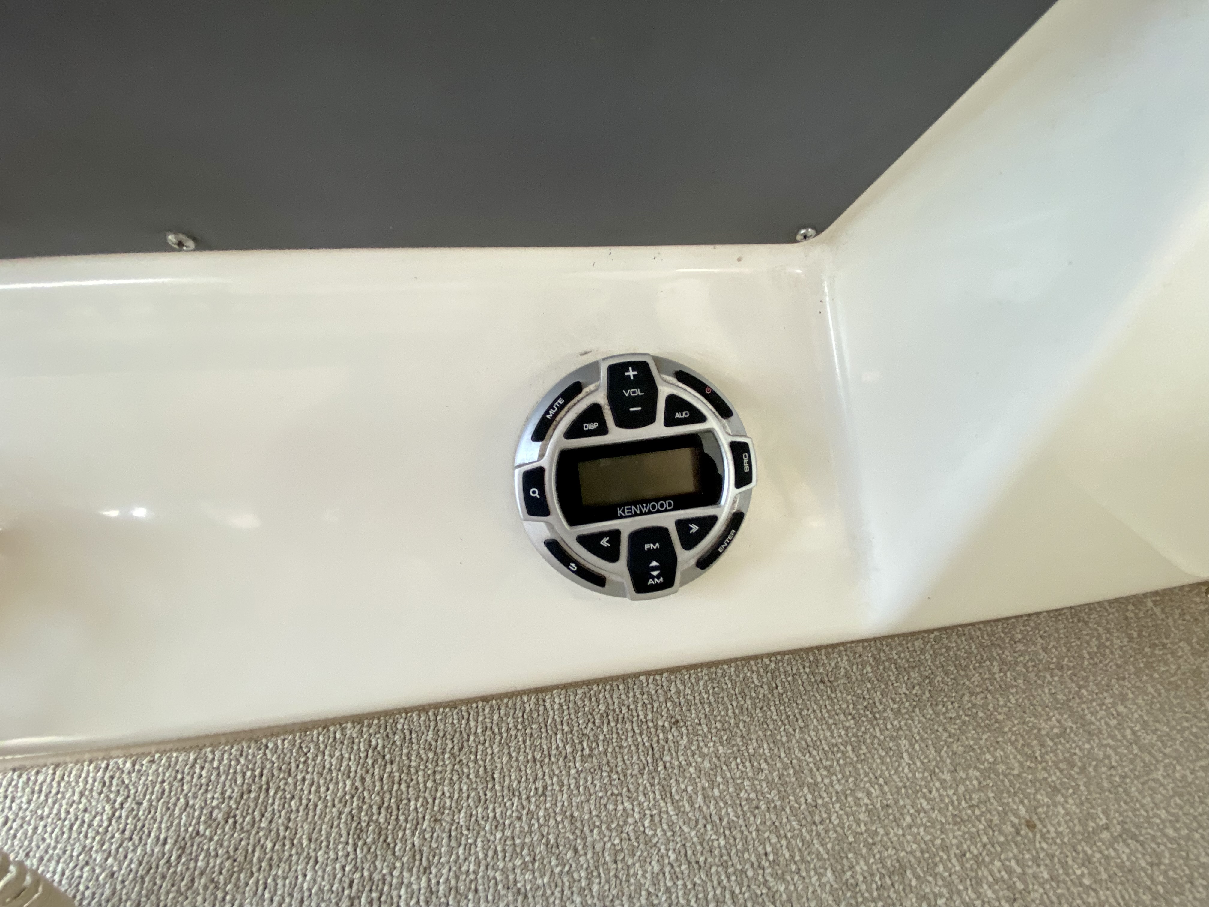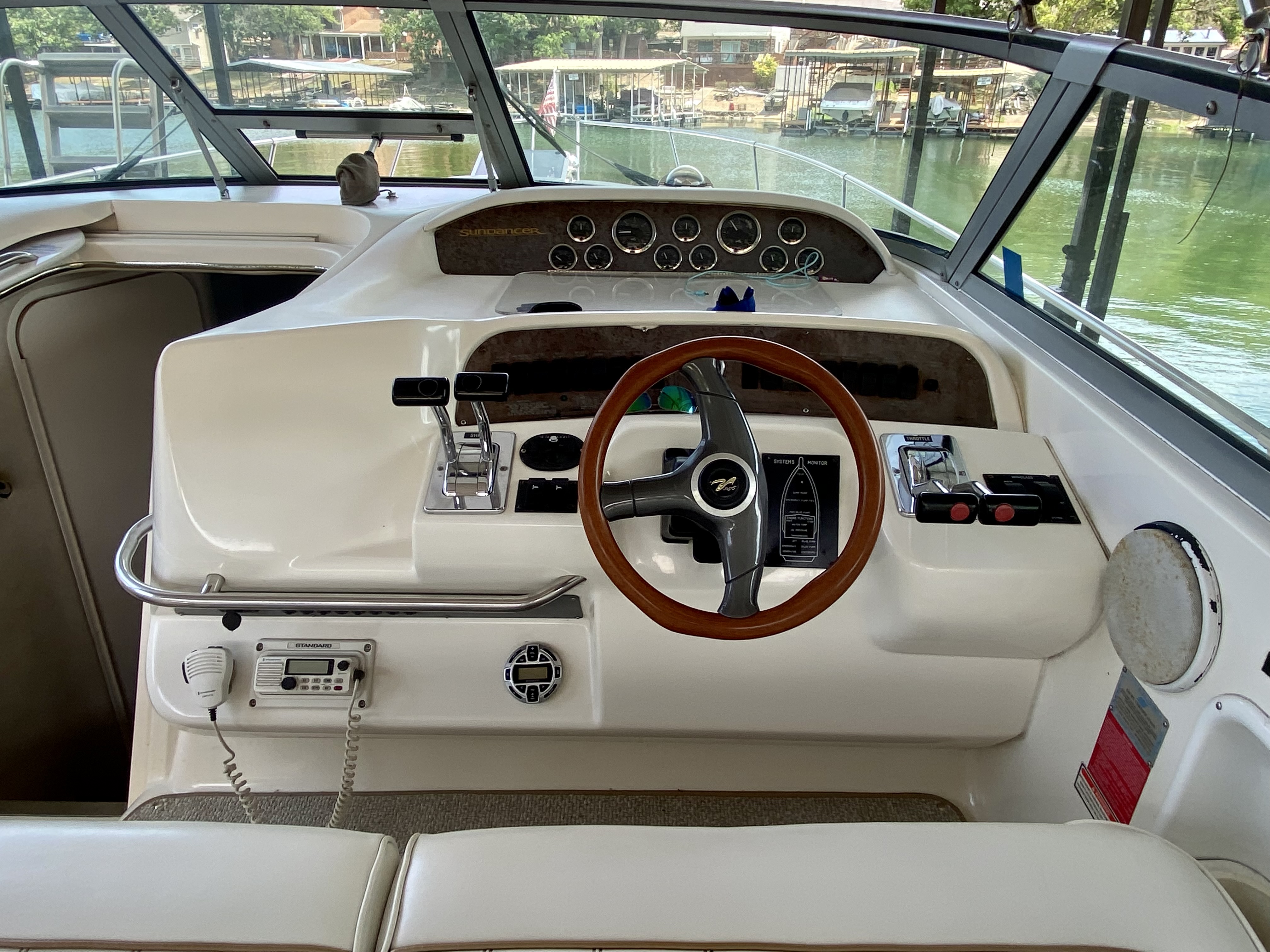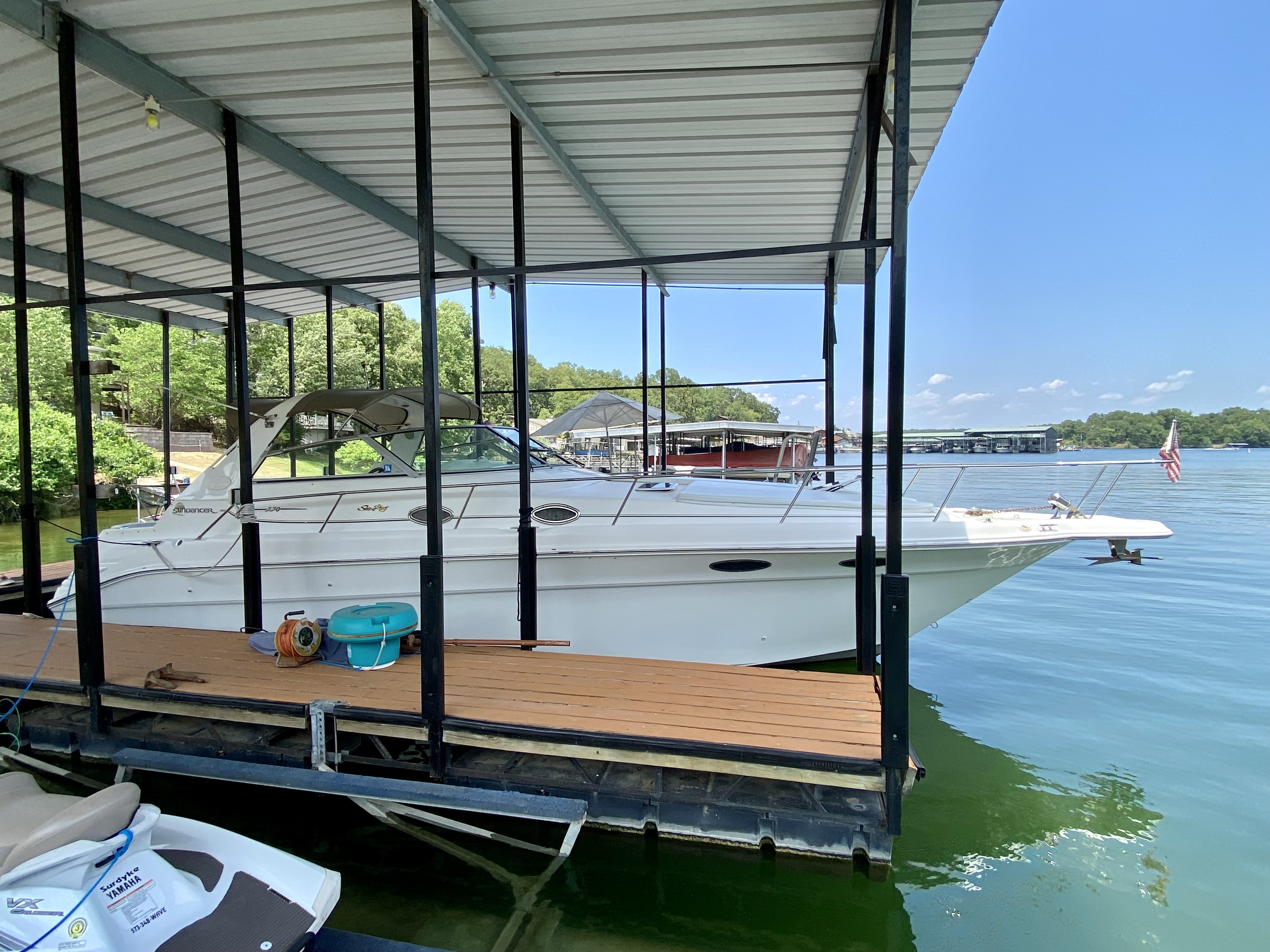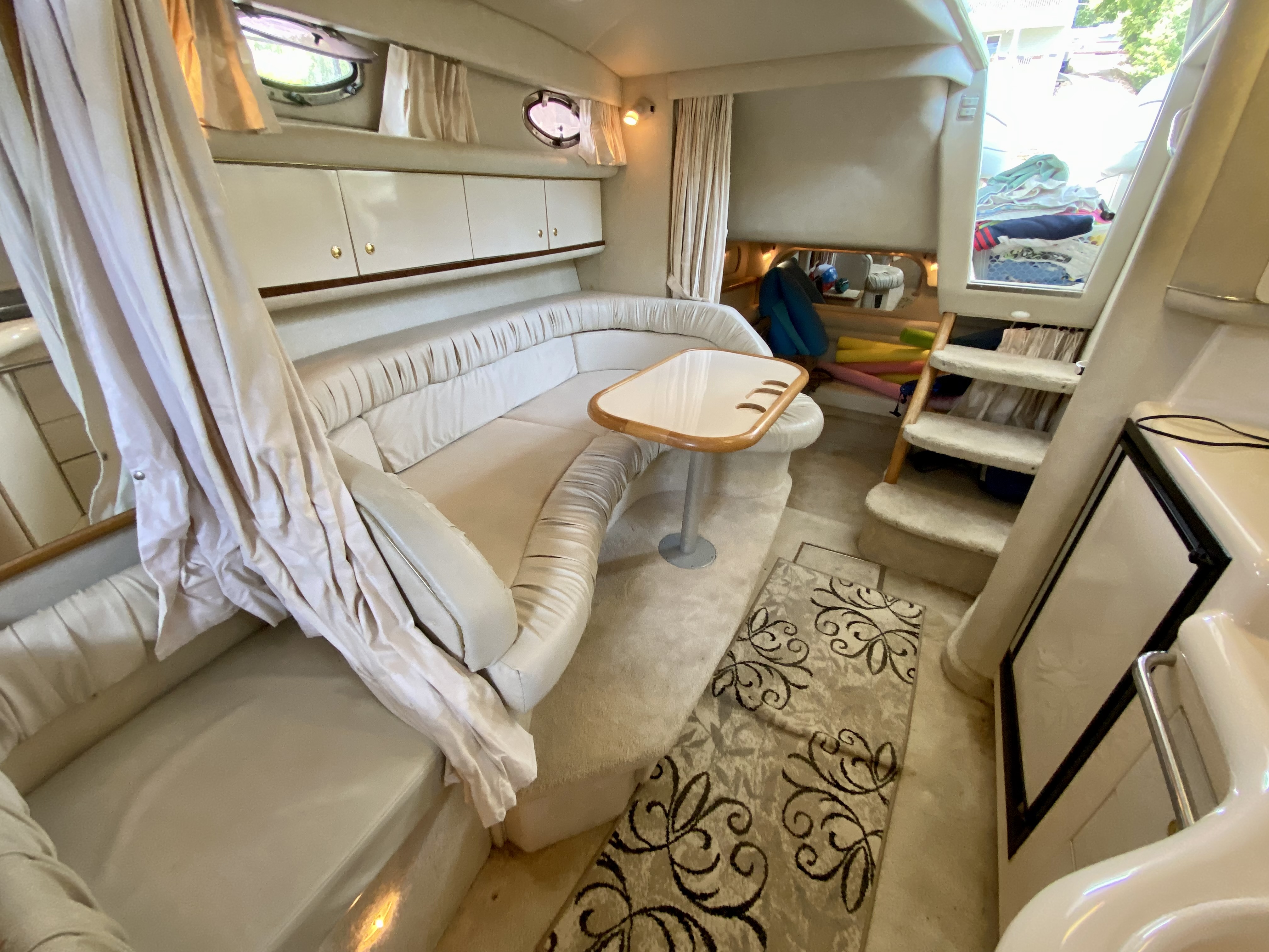 Deck/Hull: Anchor, pulpit, dock power, compass, spotlight, windshield wipers, shore water, wet bar with refrigerator, large custom bow sunpad, updated cockpit carpet, extended swim platform, transom shower, arch, bimini top, and partial full enclosure.
