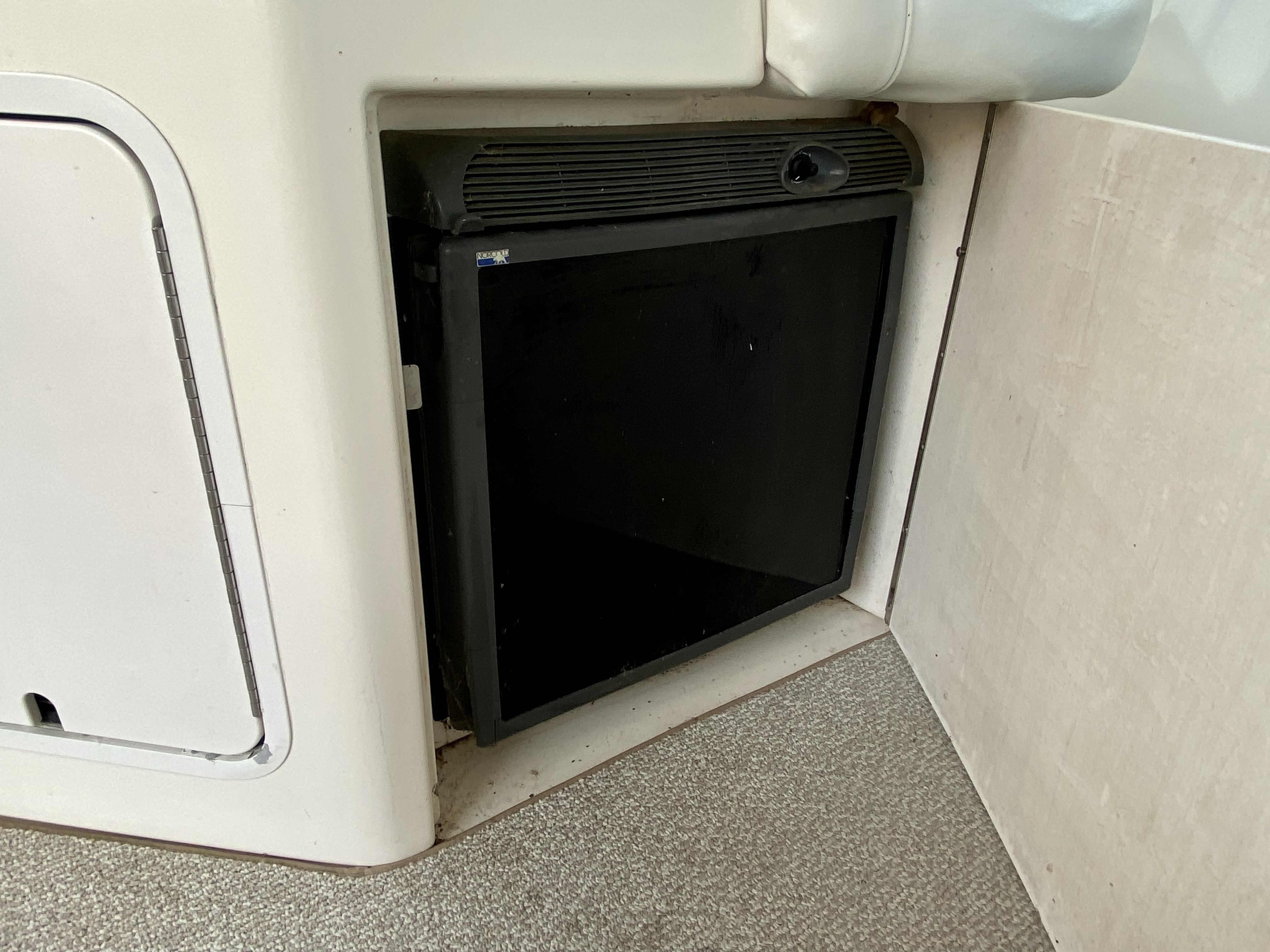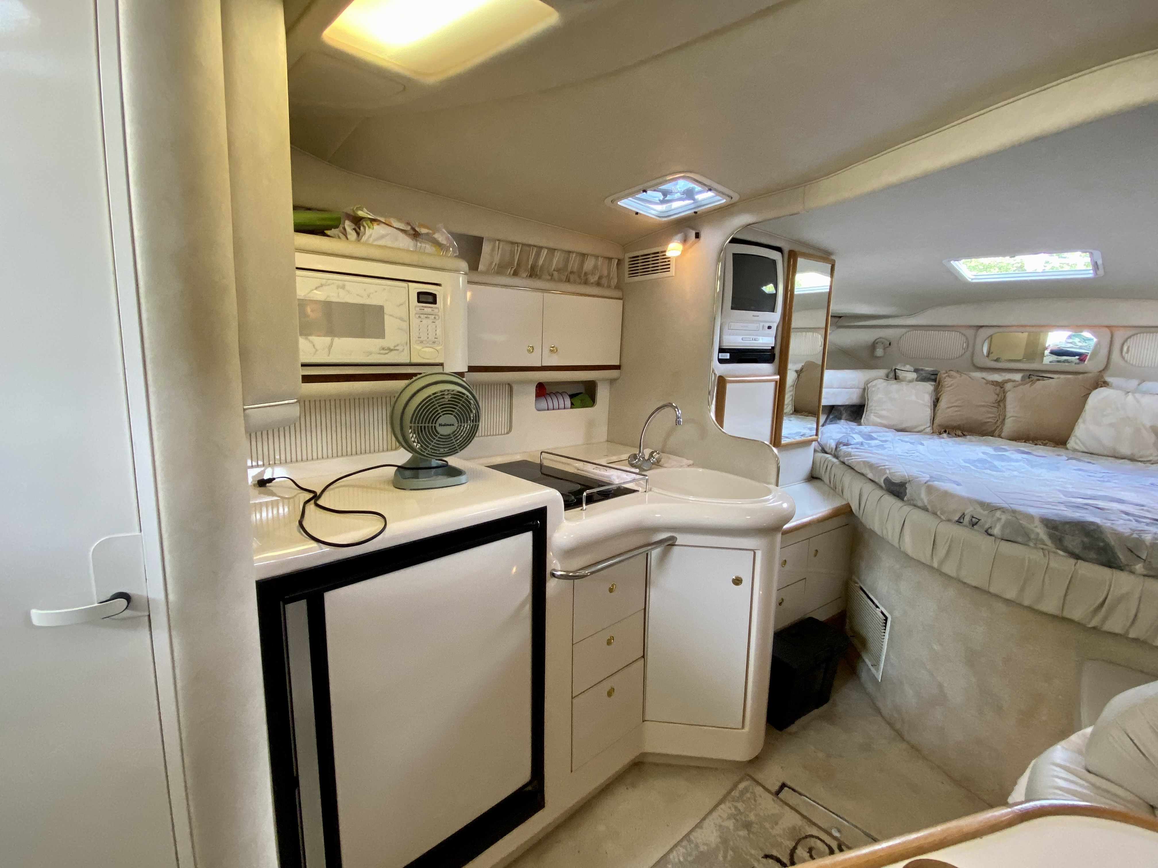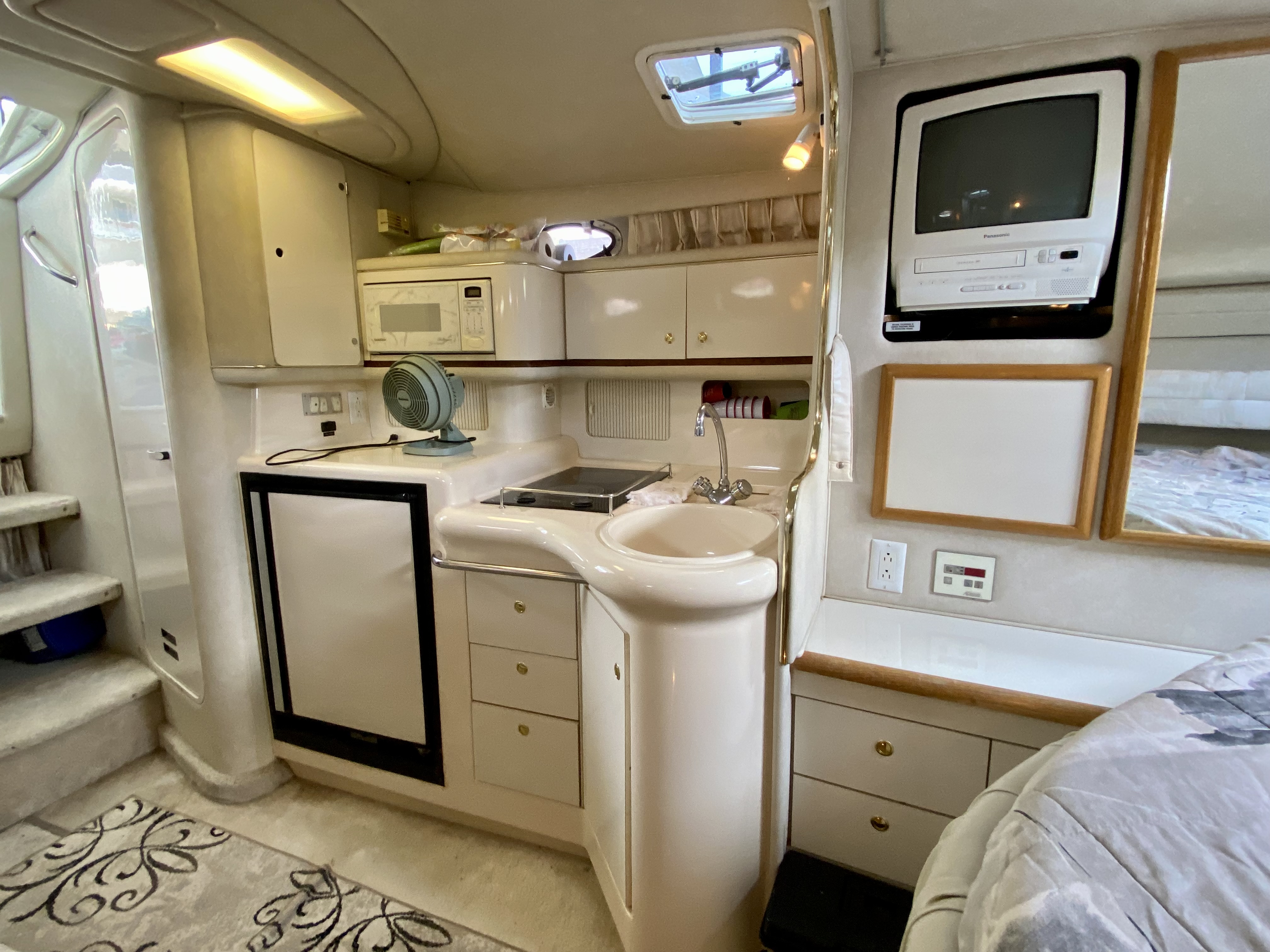 Galley: 2 burner electric range, microwave, refrigerator/freezer, sink, and dinette.