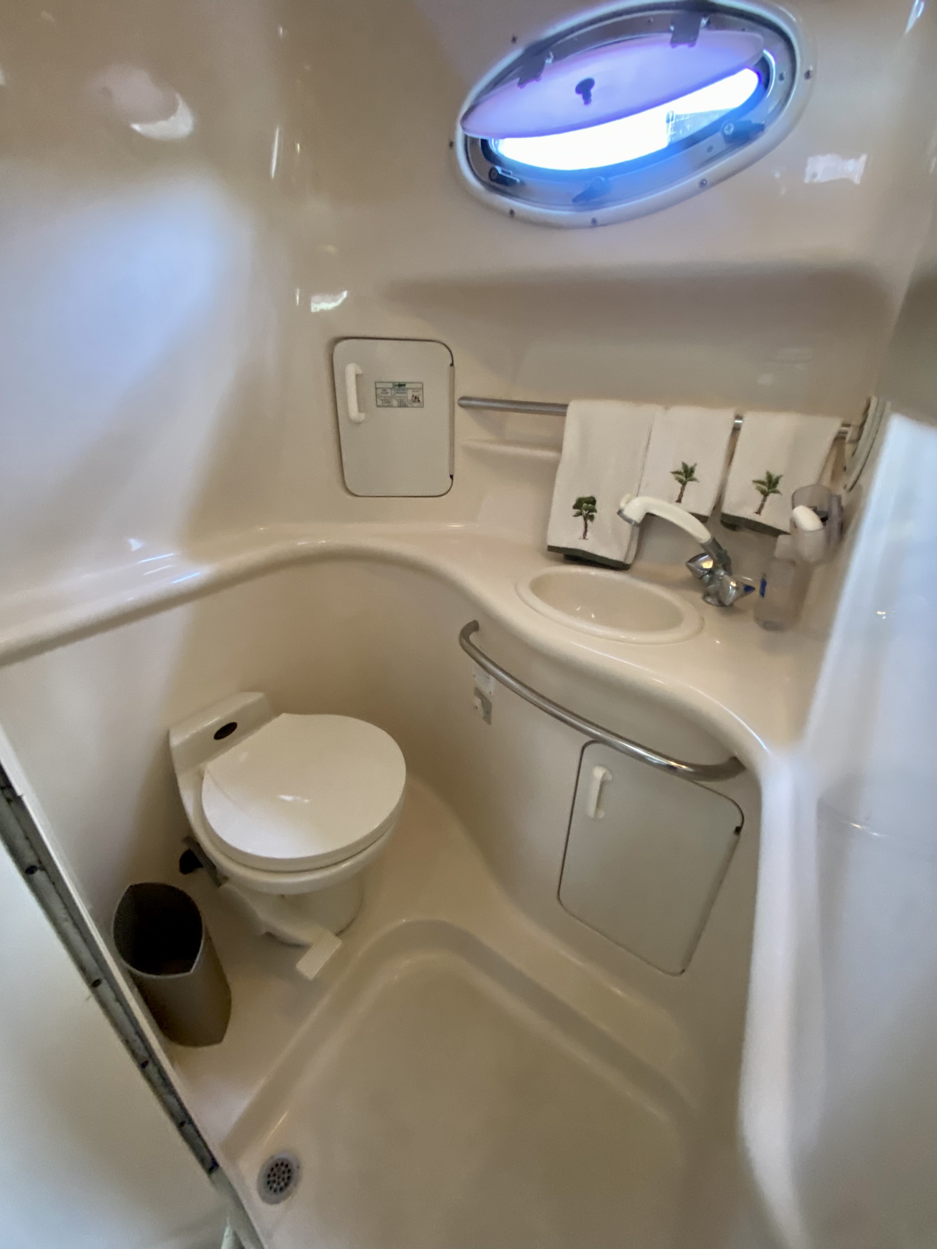 Accommodations: Forward stateroom with queen berth, queen berth mid-cabin, salon dinette converts to additional sleeping, Panasonic 16” TV with VCR, Kenwood Marine stereo system with remote, vacu flush head with shower, and central vac system.