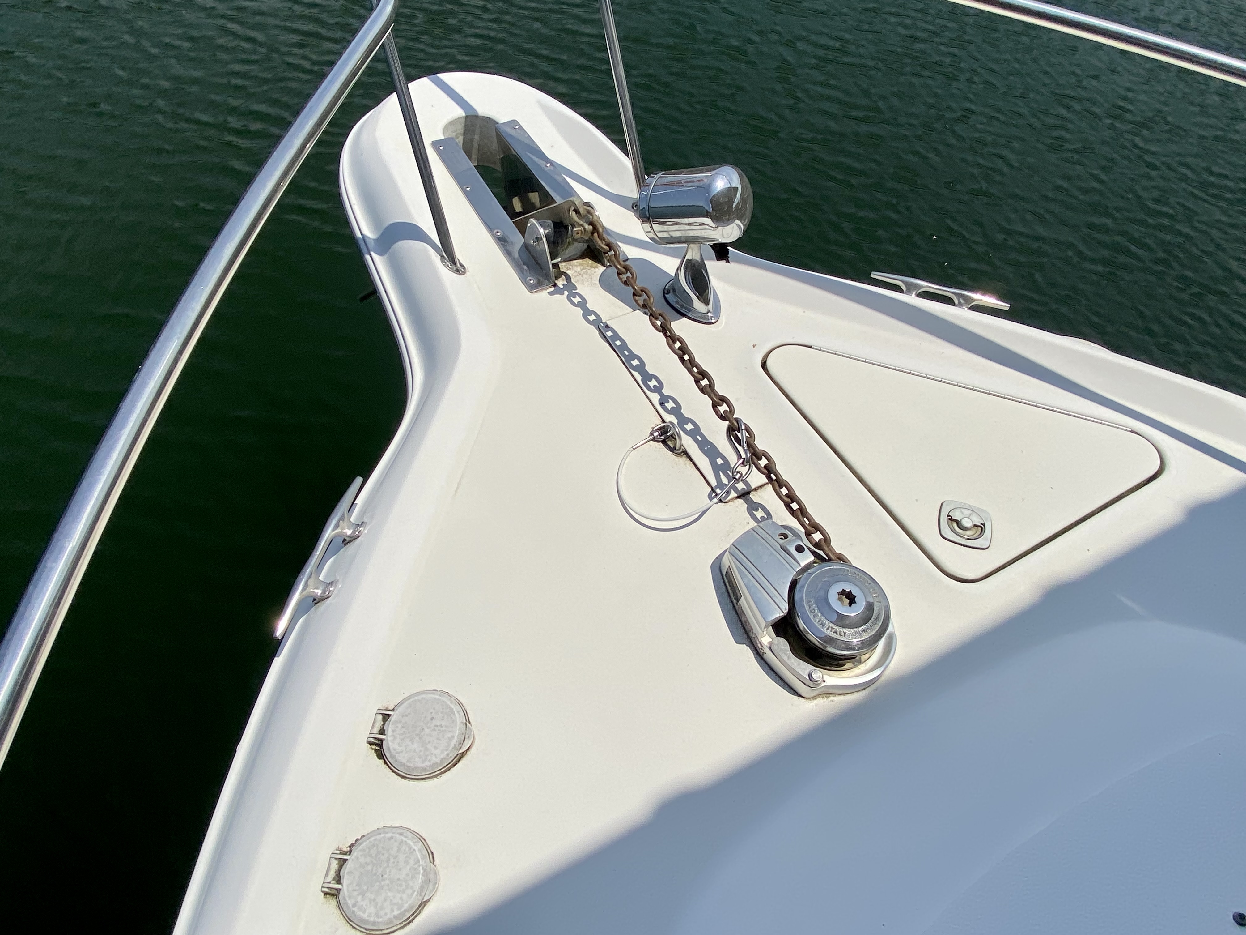 Elec/Mech: A/C-Heat, windlass, depthfinder, synchronizer gauge, trim tabs, VHF, halon, water heater, and battery charger.