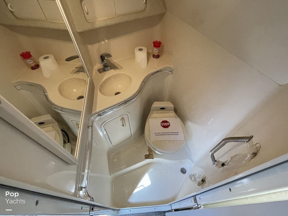 The enclosed head is to starboard and is outfitted with a vacuum flush head, a vanity with sink, a shower wand, and a power vent.