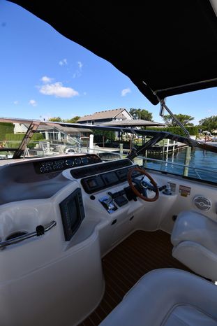 Freshwater / Great Lakes boat since new this vessel features Twin MerCruiser 496-MAG H.O. 425-hp Gas Engine's (Note 1047 total boat hours & 450-hours on re-power.) Notable features include but are not limited to the following: Air-Conditioning & Heat (2-Zones), (2) Heads (Vacuflush) w/Vanity/Sink/Shower (Stall-Shower in Forward Head), Central Vacuum, Westerbeke Generator (419-hrs), Windlass Anchor w/Forward Pedal Controls, Raytheon Electronics Package (VHF Marine Radio, Radar, GPS/Chartplotter, Autopilot, etc.), NEWER Canvas Package (Cockpit Mooring Cover, Forward & Aft Bimini's w/Full Isin-Glass Surround & Slant-Back Rear), Cockpit Wet Bar w/Sink/Ice-Maker, Snap-in Snap-out Cockpit Carpeting, Upgraded Bluetooth Sound System w/iPod/MP3-Connection (Note Upgraded Speakers), and MUCH more!