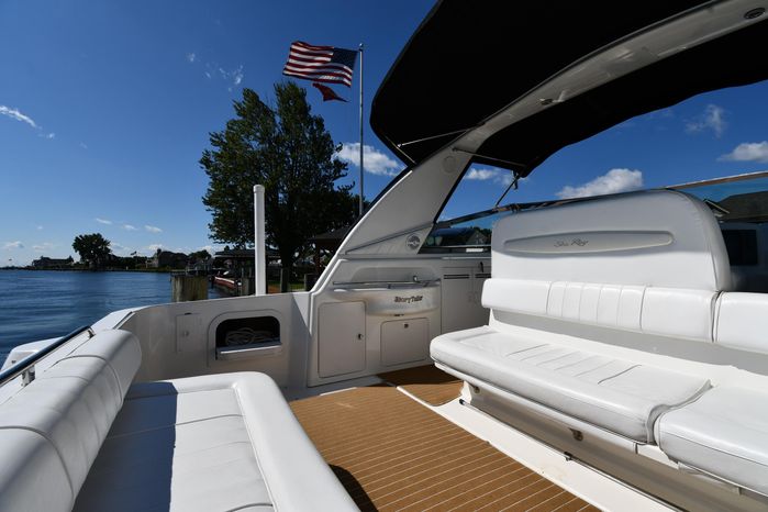 Long on styling and loaded with cruising amenities, the Sea Ray 400 Sundancer combines the key elements of an American sportcruiser including a large comfortable cockpit and spacious, well-appointed interior. She's built on a deep-V hull with a solid fiberglass bottom, moderate beam, and prop pockets to reduce the shaft angles of her V-drive engines. The mid-cabin floor-plan of the 400 Sundancer is arranged in the conventional manner with the owner's stateroom forward, and open galley in the main cabin, and a mid-cabin stateroom/lounge with a privacy door. Note that there's a second head adjoining the mid-cabin--a very desirable feature indeed. The forward head has a stall shower, and the level of fit and finish throughout is second to none. Topside, the huge U-shaped cockpit lounge will seat a small crowd, and the entire aft section of the cockpit sole raises up electronically without moving the aft seat for engine access. Foldaway boarding steps, a radar arch, and a transom storage locker were standard. An extended swim platform was a popular option in later models.