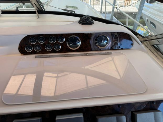 A well taken care of boat with shiny gel coat helped by it's covered slip at Bayport Marina.