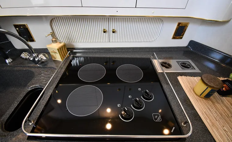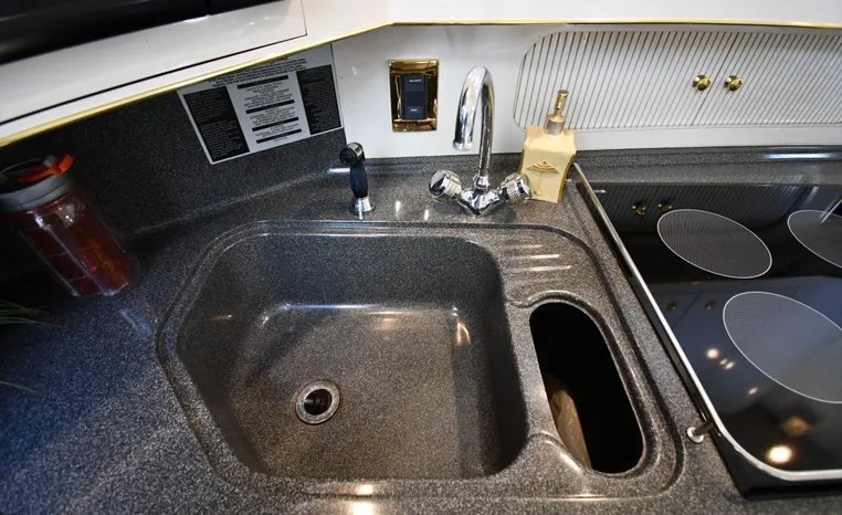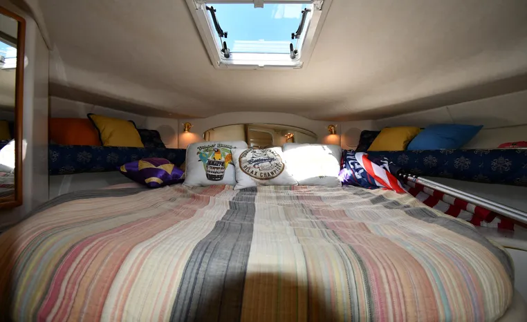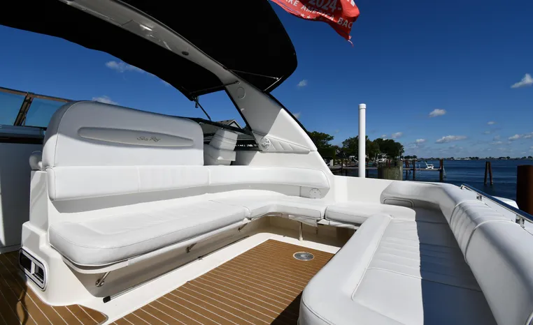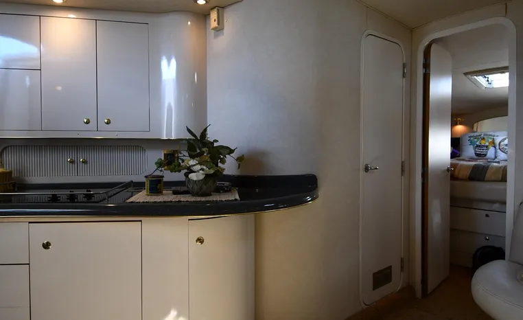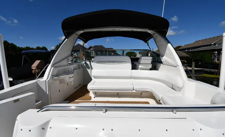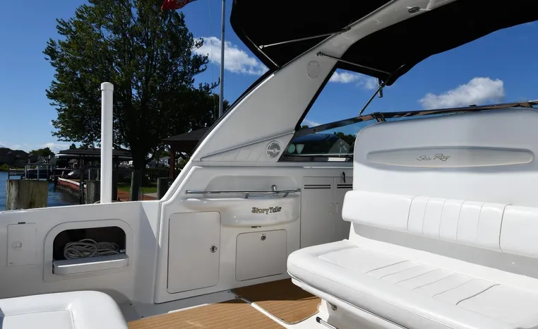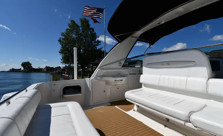 Long on styling and loaded with cruising amenities, the Sea Ray 400 Sundancer combines the key elements of an American sportcruiser including a large comfortable cockpit and spacious, well-appointed interior. She's built on a deep-V hull with a solid fiberglass bottom, moderate beam, and prop pockets to reduce the shaft angles of her V-drive engines. The mid-cabin floor-plan of the 400 Sundancer is arranged in the conventional manner with the owner's stateroom forward, and open galley in the main cabin, and a mid-cabin stateroom/lounge with a privacy door. Note that there's a second head adjoining the mid-cabin--a very desirable feature indeed. The forward head has a stall shower, and the level of fit and finish throughout is second to none. Topside, the huge U-shaped cockpit lounge will seat a small crowd, and the entire aft section of the cockpit sole raises up electronically without moving the aft seat for engine access. Foldaway boarding steps, a radar arch, and a transom storage locker were standard. An extended swim platform was a popular option in later models.