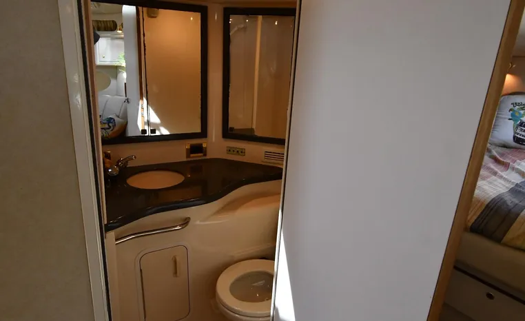 Freshwater / Great Lakes boat since new this vessel features Twin MerCruiser 496-MAG H.O. 425-hp Gas Engine's (Note 1047 total boat hours & 450-hours on re-power.) Notable features include but are not limited to the following: Air-Conditioning & Heat (2-Zones), (2) Heads (Vacuflush) w/Vanity/Sink/Shower (Stall-Shower in Forward Head), Central Vacuum, Westerbeke Generator (419-hrs), Windlass Anchor w/Forward Pedal Controls, Raytheon Electronics Package (VHF Marine Radio, Radar, GPS/Chartplotter, Autopilot, etc.), NEWER Canvas Package (Cockpit Mooring Cover, Forward & Aft Bimini's w/Full Isin-Glass Surround & Slant-Back Rear), Cockpit Wet Bar w/Sink/Ice-Maker, Snap-in Snap-out Cockpit Carpeting, Upgraded Bluetooth Sound System w/iPod/MP3-Connection (Note Upgraded Speakers), and MUCH more!