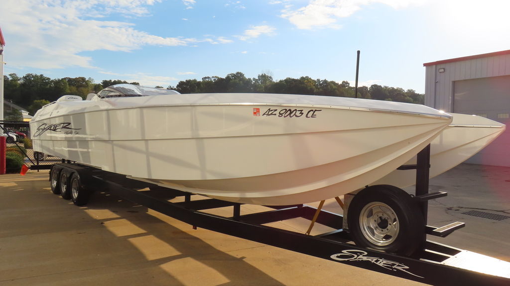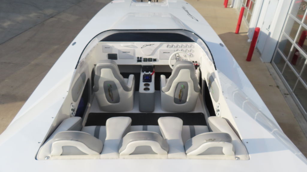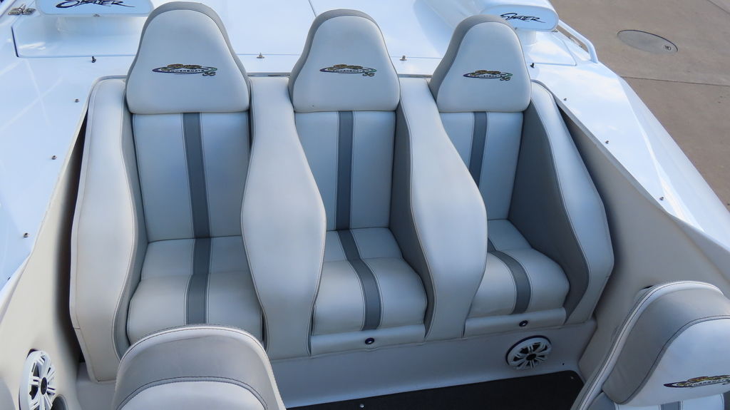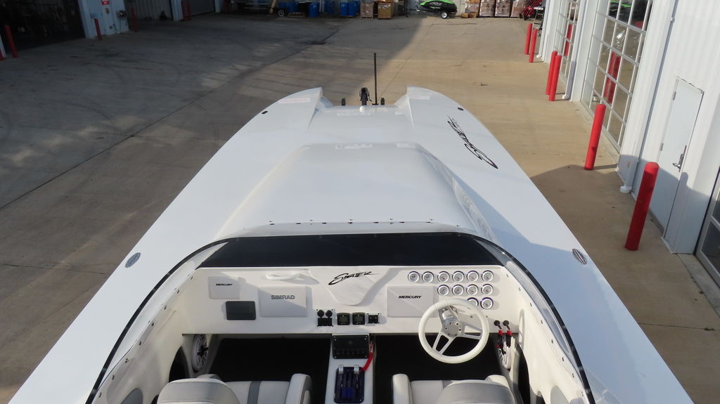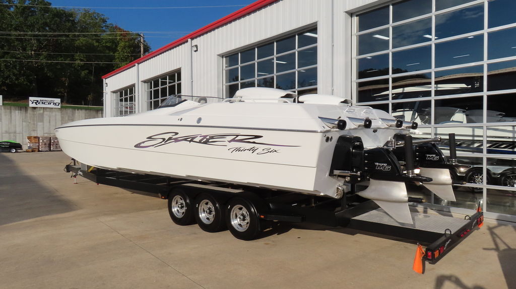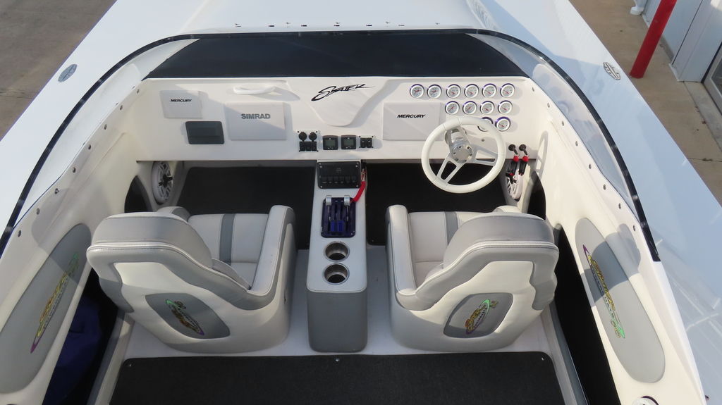 1997 Skater 36 Powered twin Mercury Racing 700s with stage 3 Whipples with 15 hours on Brand New Motors and M6 Drives rebuilt 25 hours ago, All recent services and $200K+ Refit/Rerigging done in the last year by PBC. 5-person cockpit with snap in carpet, Twin Mercury Vessel view displays, Simrad GPS Chart plotter, JL Audio Head Unit with JL and Kicker Speakers, Upgraded wrap-around windshield, Cockpit cover, and Triple axle trailer included!