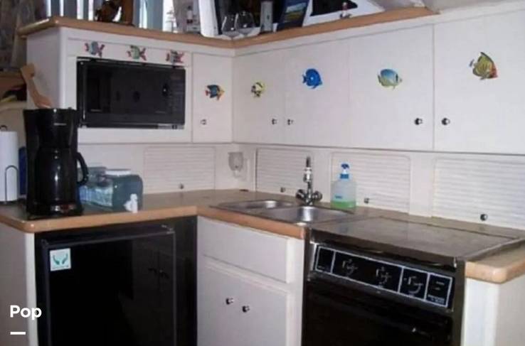Amenities include a full galley with a fridge, sink, stovetop and plenty of storage. The head has a vacu-flush toilet, sink and vanity and shower. It is a wet head meaning there is no separate shower stall.