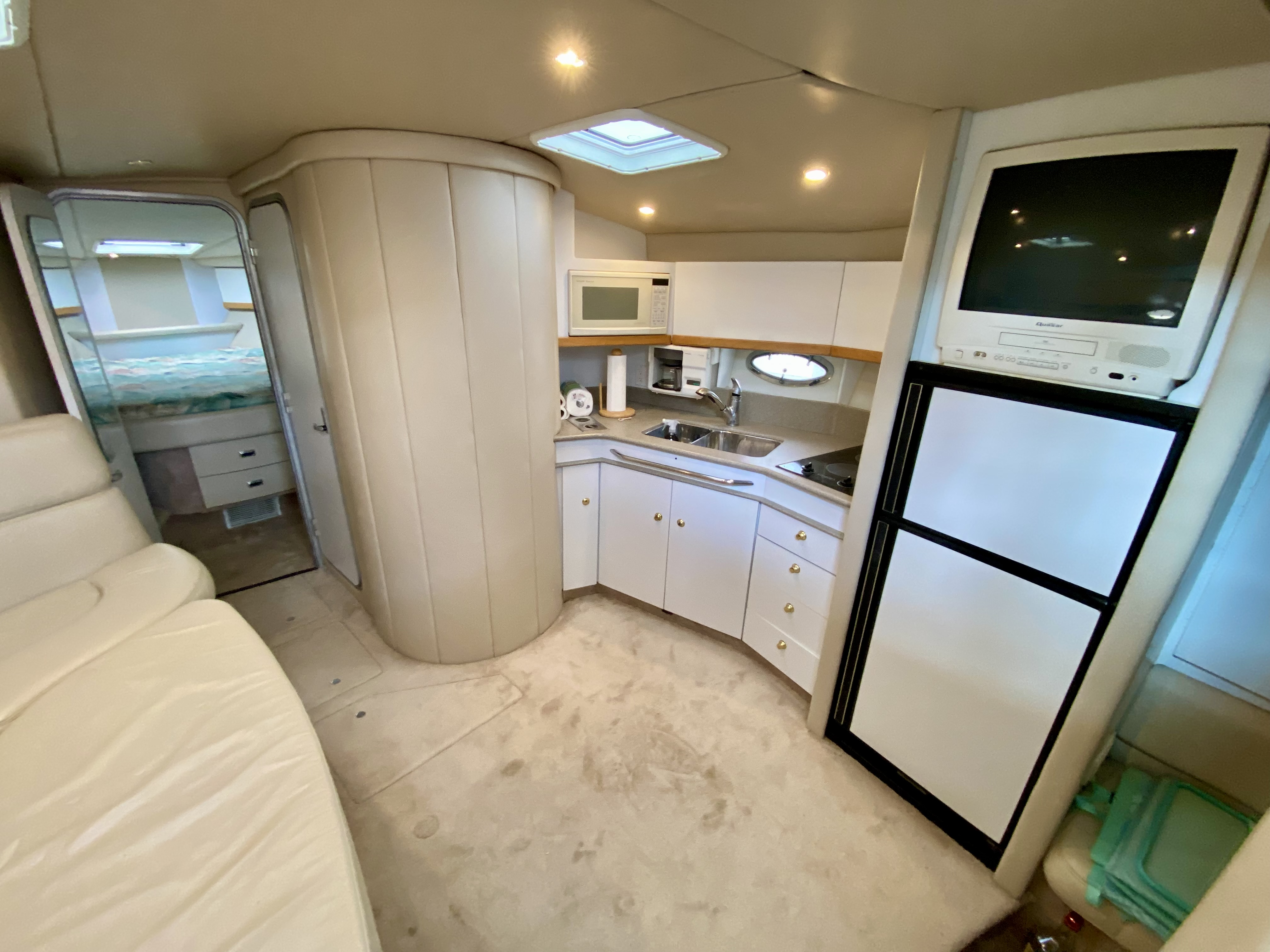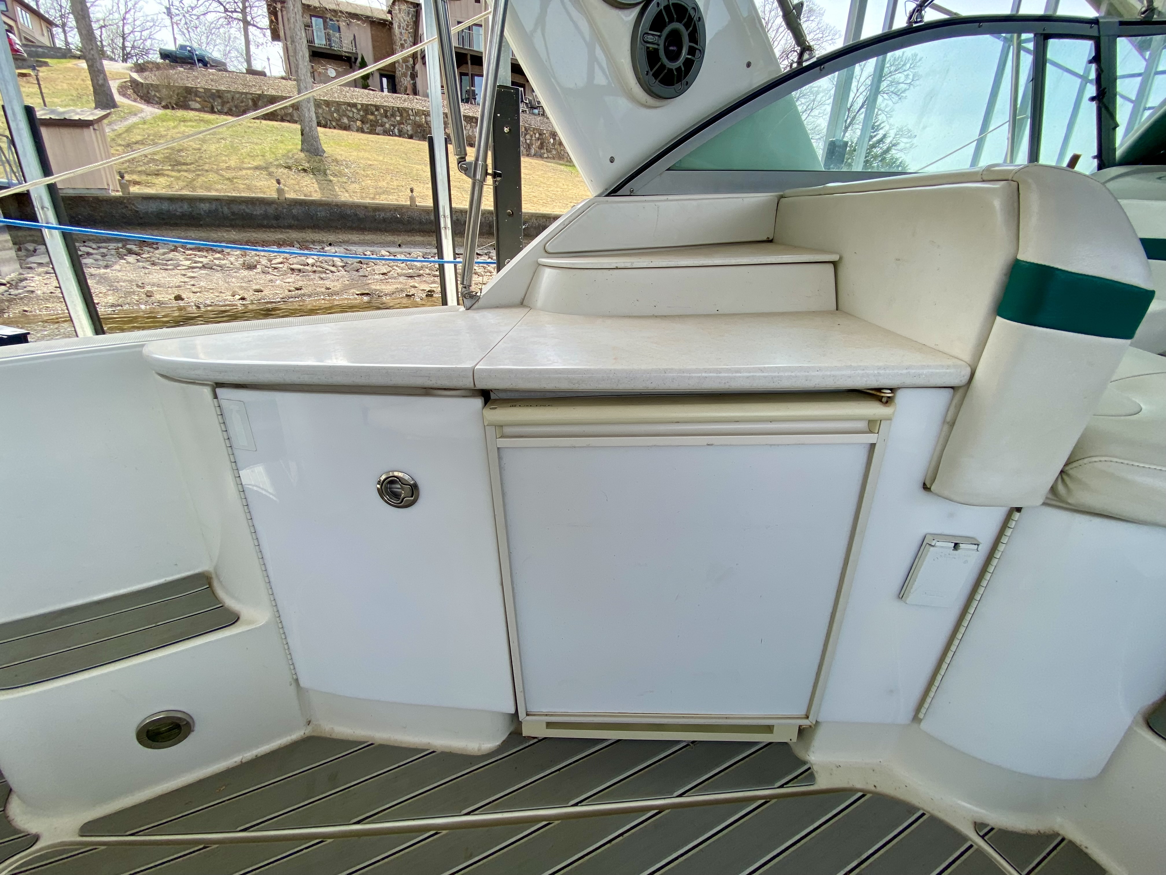 Wet bar in cockpit with sink and refrigerator/freezer combo
