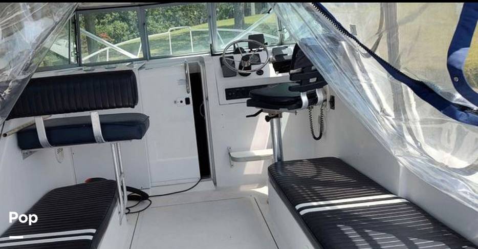 The boat is equipped with A/C and heat, a battery charger, a fishfinder, bow thrusters, a VHF radio, a windlass, autopilot setting, and a Simrad chartplotter.
