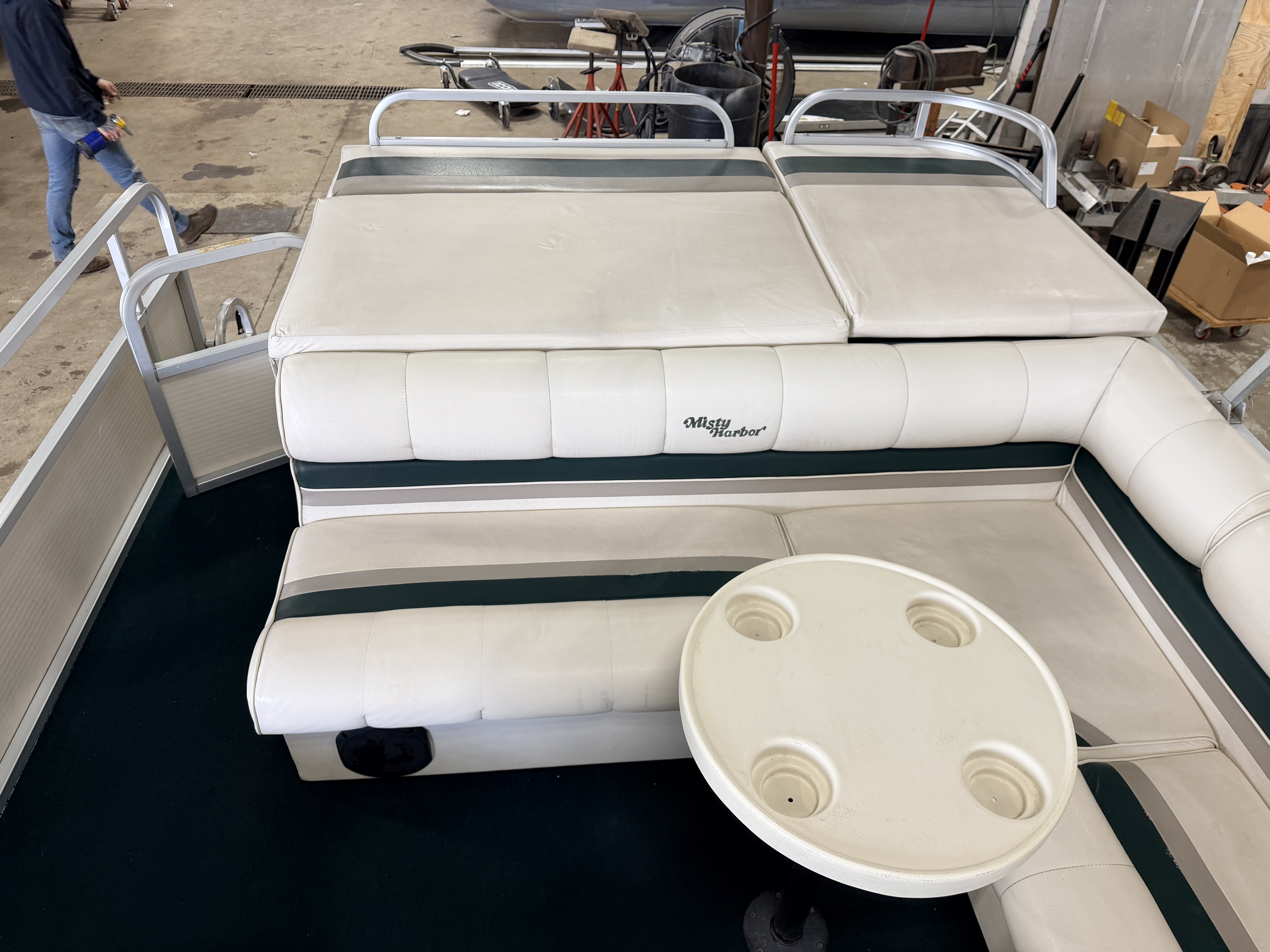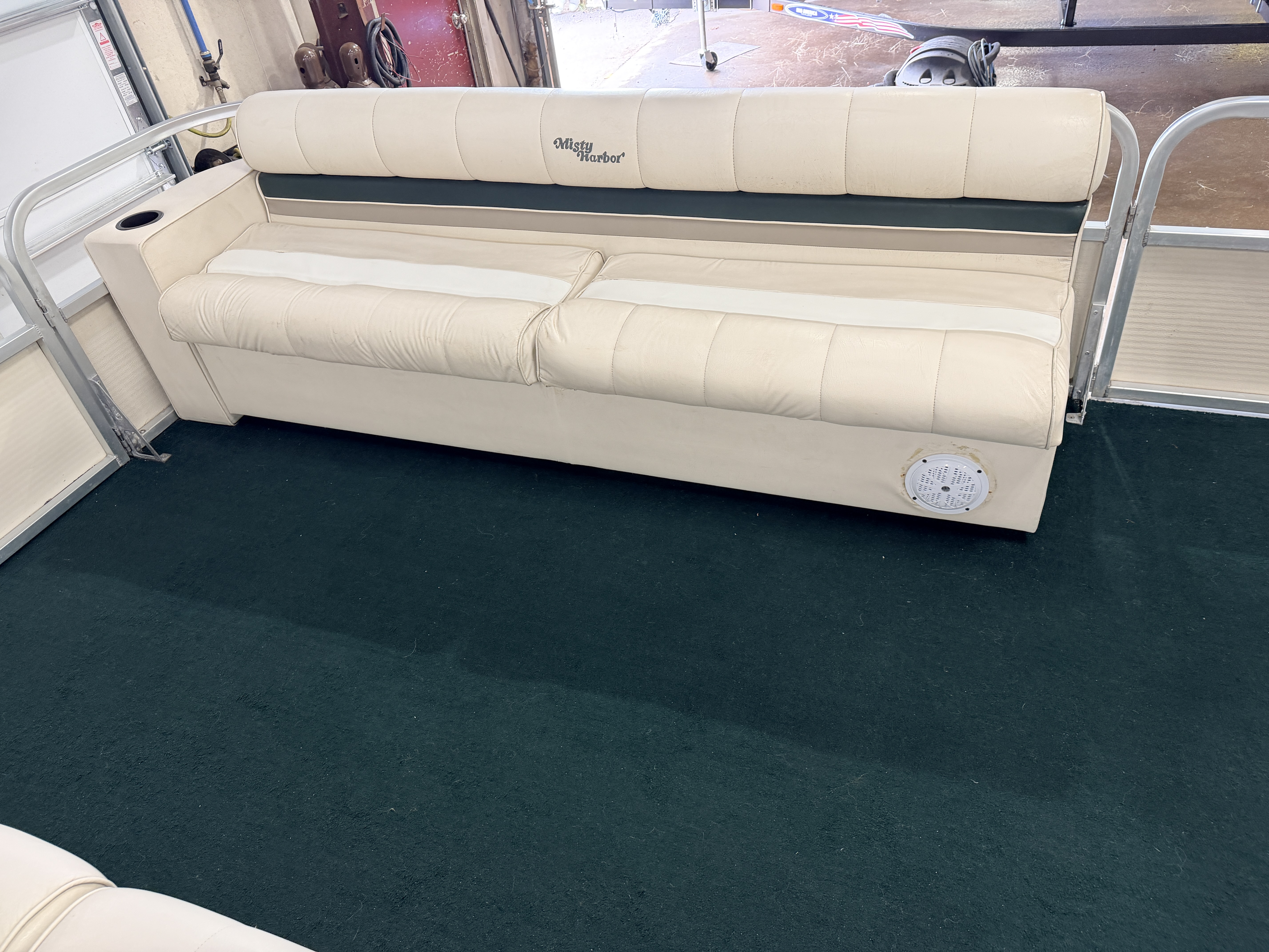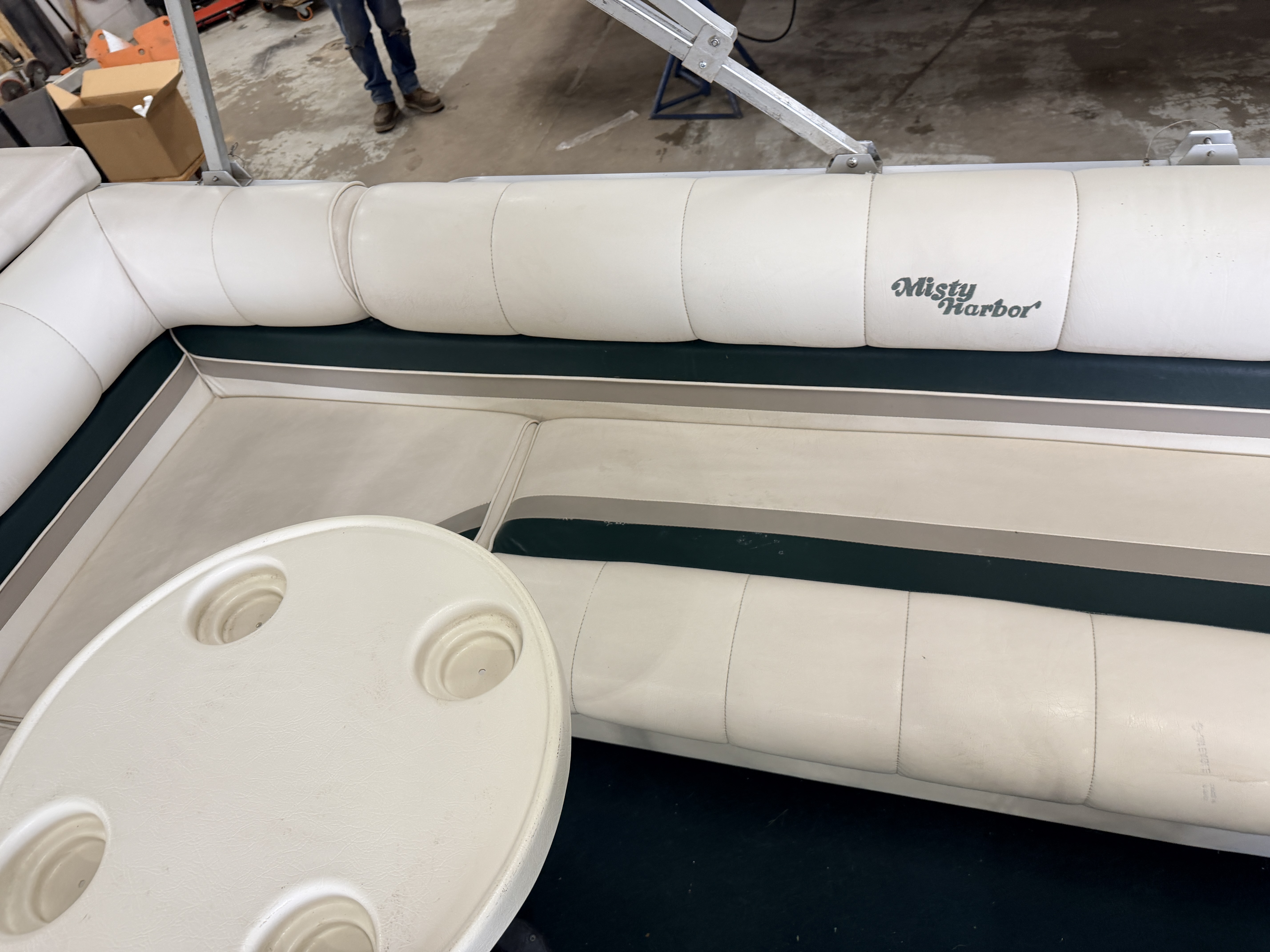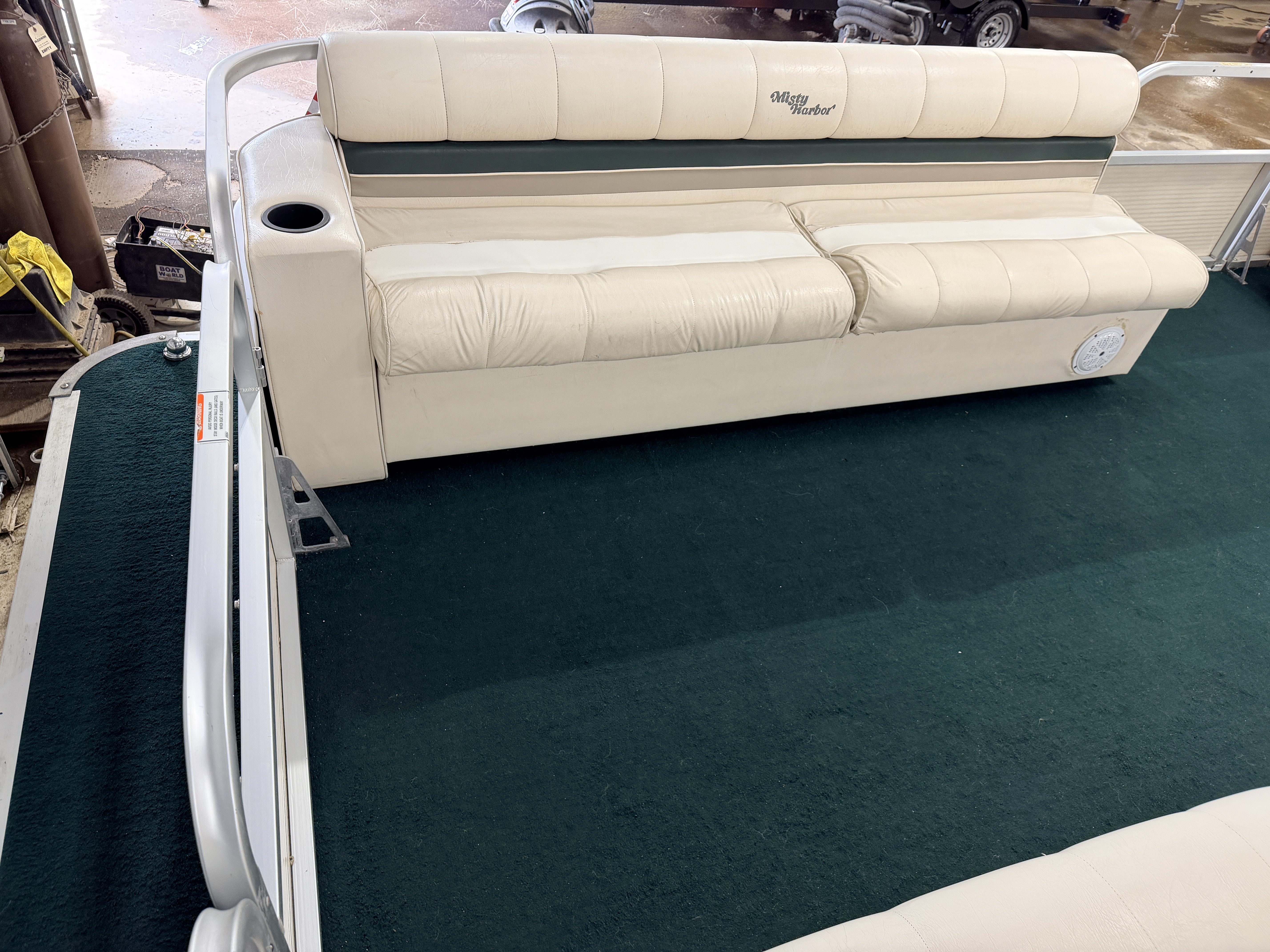 1998 Misty Harbor 2424 Pontoon & 60HP Mercury Bigfoot. Interior seating includes 2 couches, L-shaped couch, Captain's Chair and Sun Deck. Features include Bimini Top, Table, In-Seat Storage, Large Storage under Sun Deck, Bow Swim Platform & Stern Swim Ladder, Speedometer, Tachometer, Fuel and Volt gauges, and Pyle Bluetooth Stereo. Additional features include LED Navigation Lights, Compass on dash, and Vertical Fishing Rod Storage on front of helm.