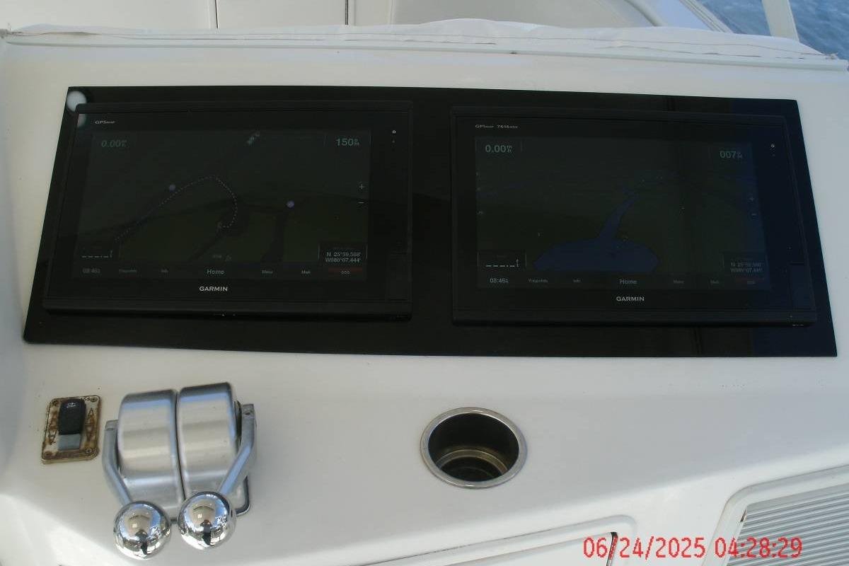 Ocean’s 48 Super Sport blends the brand’s proven hull with a comfortable, three-stateroom interior—ideal for family cruising or serious fishing. CAT 3196 power (1,320 hp total) provides strong torque and efficient cruise, while the 10 kW generator supports twin A/C units to keep the salon and cabins cool at the dock or on the hook. At the helm, twin 16″ Garmin touchscreens with radar modernize navigation, and a Bose system plus flat-screen TVs add entertainment off the water.