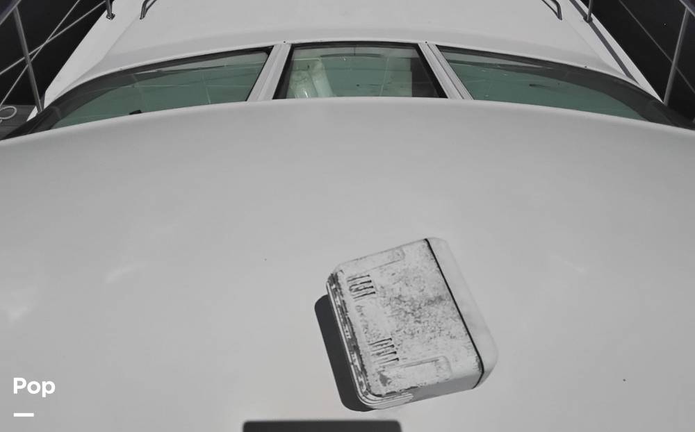 It's got a large swim platform with a ladder, perfect for easy water access, and wide side decks so it's a breeze getting to the bow. The flybridge is fully enclosed with canvas or isinglass and has plenty of seating up top--including dual helm seats and guest space--plus great visibility for docking or just enjoying the view.