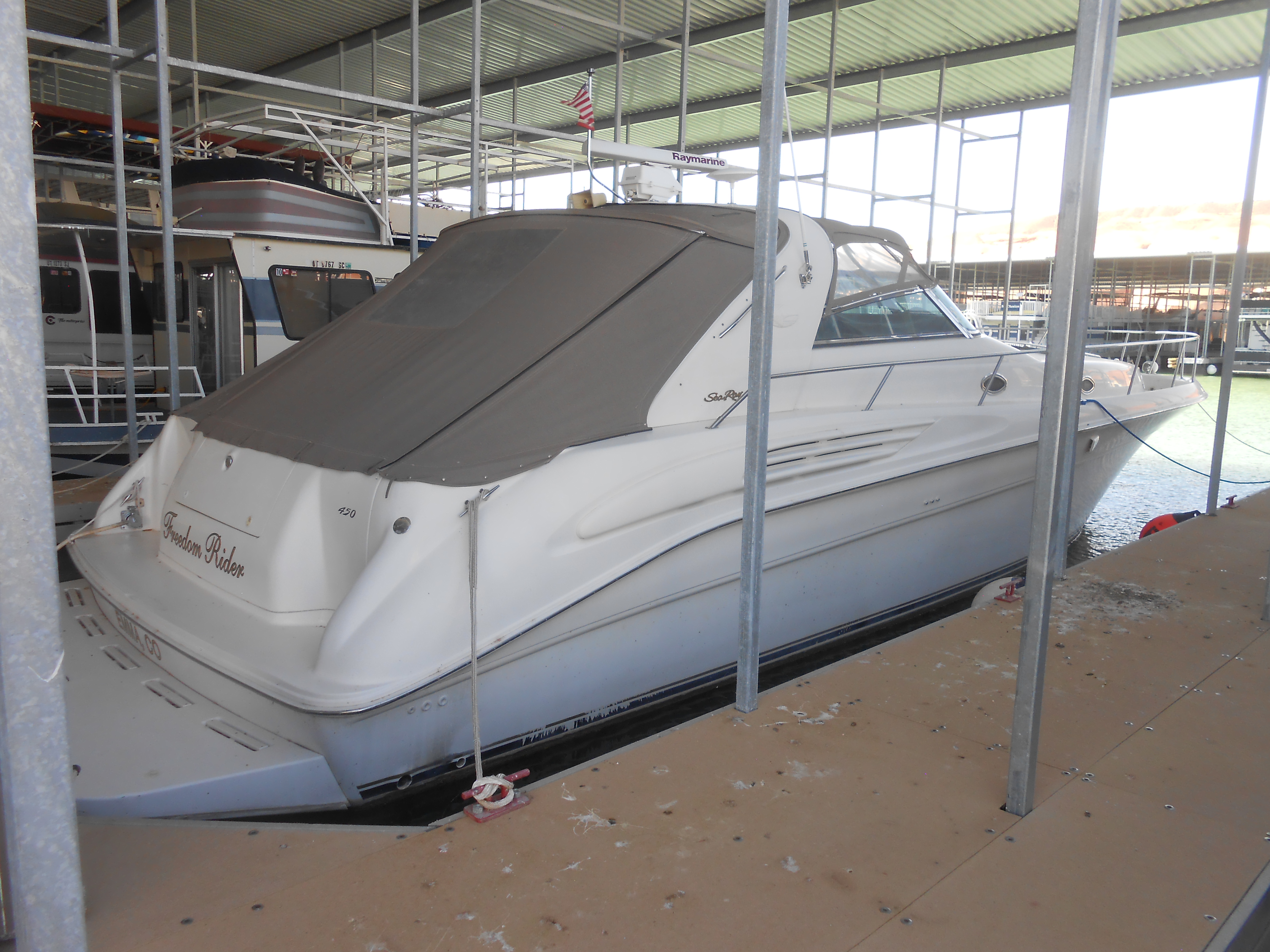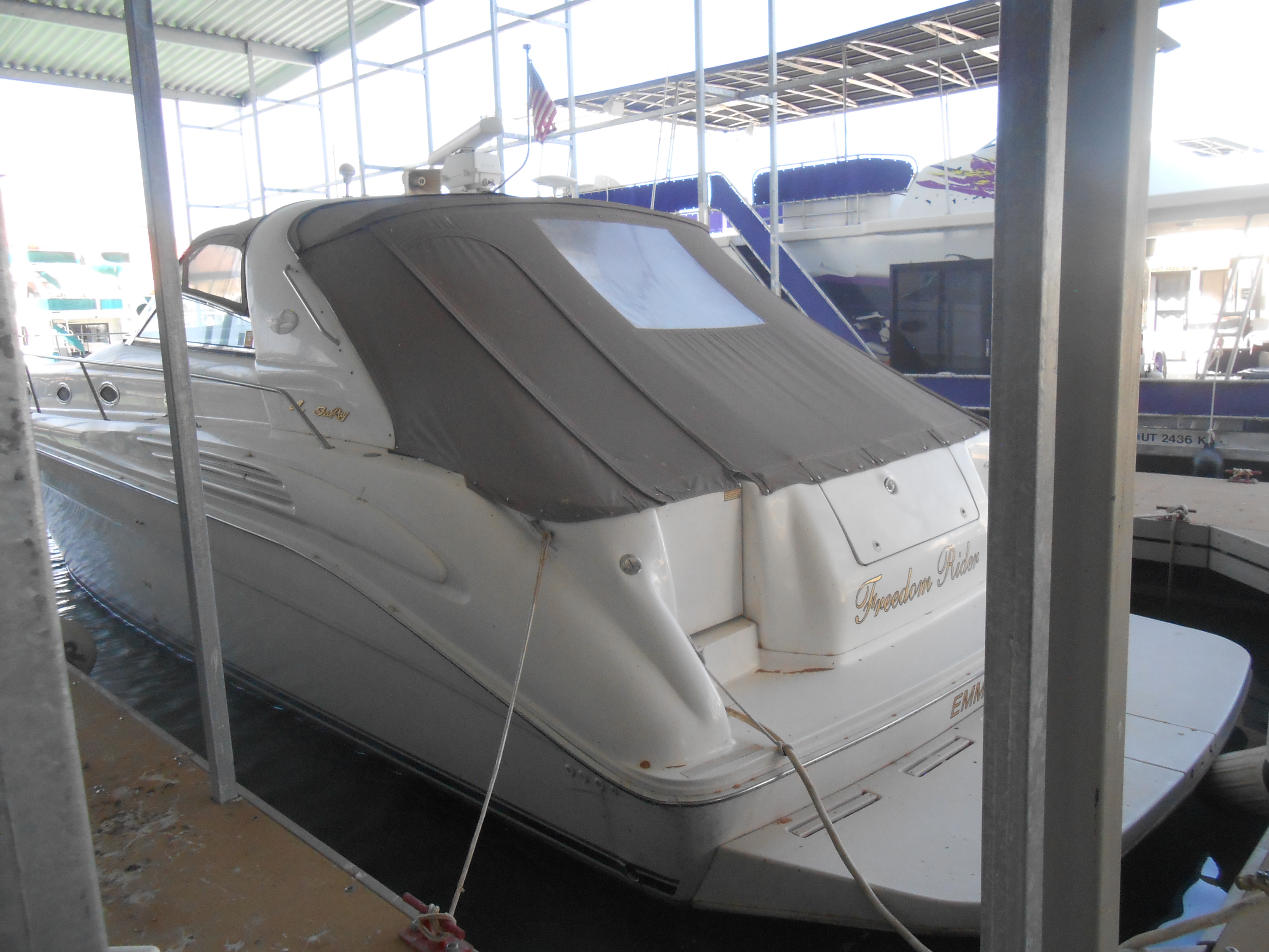 Cruise Lake Powell in comfort and style aboard this 1997 Sea Ray Sundancer 450, powered by dependable twin Caterpillar 3126 diesel engines. This well-appointed express cruiser is moored in a covered slip at Bullfrog Marina—offering both performance and protection in one of the lake’s most desirable locations.