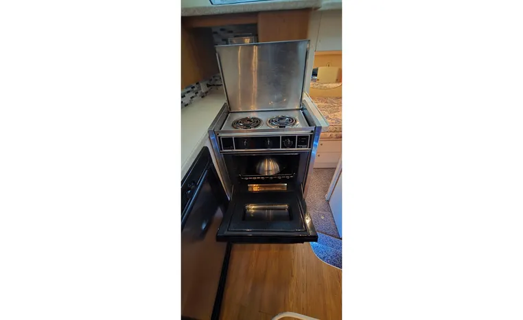 Silverton introduced their unique "SideWalk" design--a full beam salon configuration with twin staircases instead of sidedecks--on the Silverton 372 Motor Yacht back in 1996. The concept has since proved popular with buyers, and while traditionalists have been critical of the styling, it's only fair to concede that there are some obvious advantages in this approach from the standpoint of interior volume. Built on a widebody modified-V hull, the ungainly, high-sided profile fo the Silverton 322 is a little hard on the eye. Accomodations, however, are what this entry-level costal cruiser is all about. With berths for eight, two heads, a dinette, and double berths in both staterooms--plus a large flybridge and modest aft deck--this is probably the most spacious 32-footer ever built. An aft deck hardtop was standard, and a curved staircase provides easy access to the swim platform. Additional features include a molded bow pulpit, transom shower, a seperate stall shower in the aft head, cherrywood interior cabinetry, and a wet bar. No lightweight, twin 350HP Mercrusier Gas engines will cruise the Silverton 322 MY at 16-17 knots and deliver a top speed in the mid-to-high 20's.