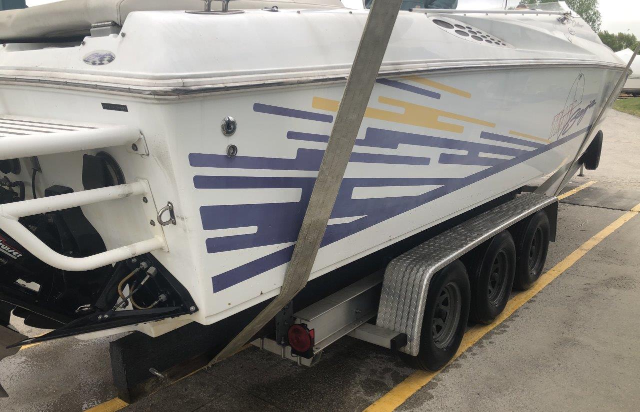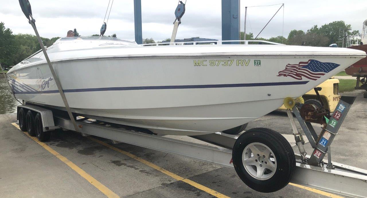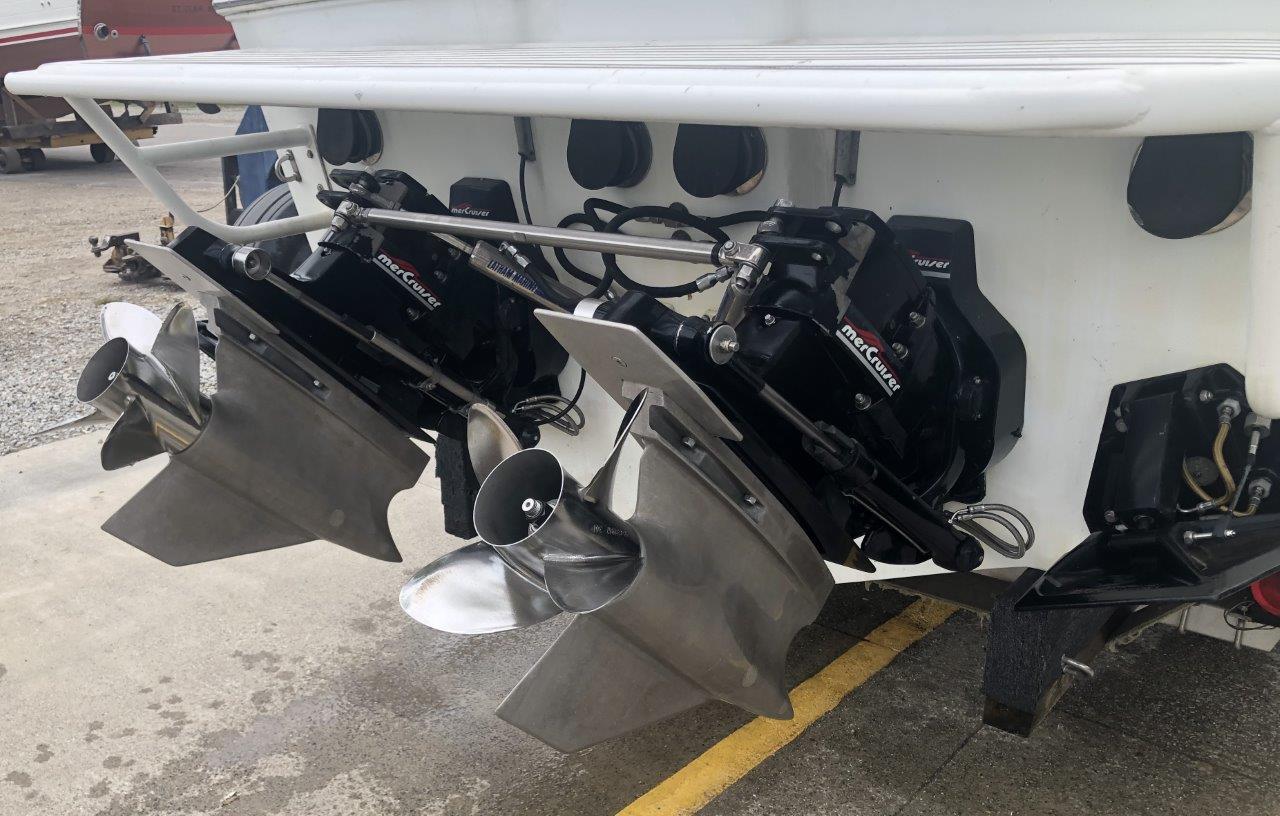 Don’t miss this clean, fast & freshwater Outlaw! She has been well-maintained and hoist-kept by her long-term owner. Other highlights include low-hour 700 HP V-8’s with Bravo / Imco shorty lowers, Lightning headers, Latham hydraulic steering, K-planes, newer Autometer gauges, custom engine cover / sunpad, full storage cover and triple-axle trailer. This is a terrific value for this much speed, style and fun on the water! Please click on Full Specs and inquire for more details…