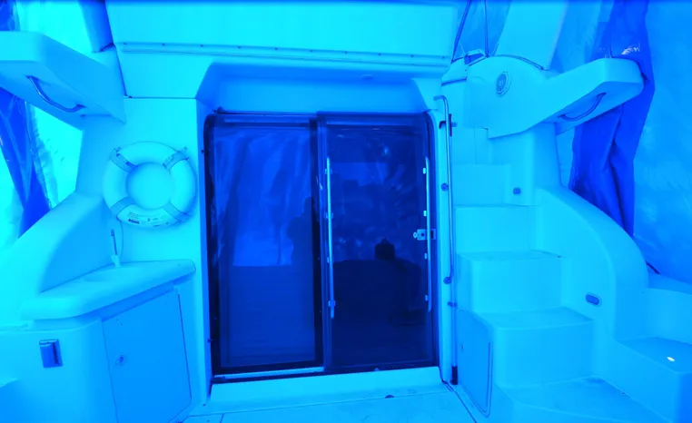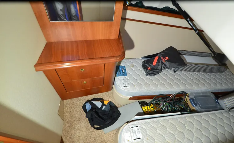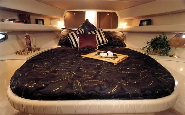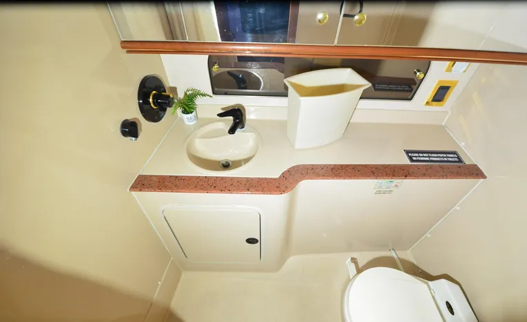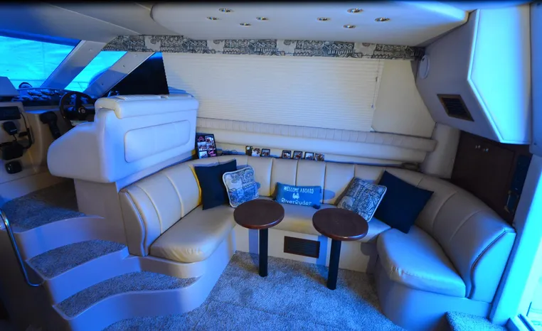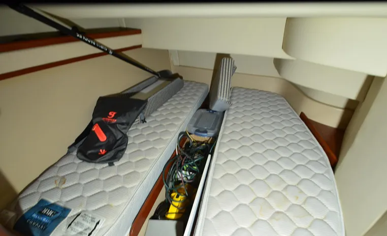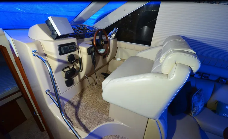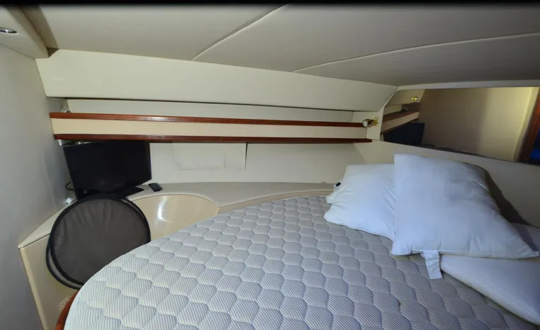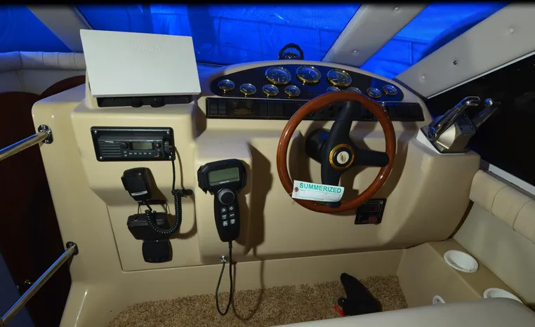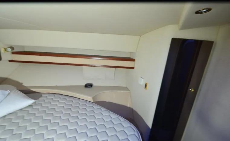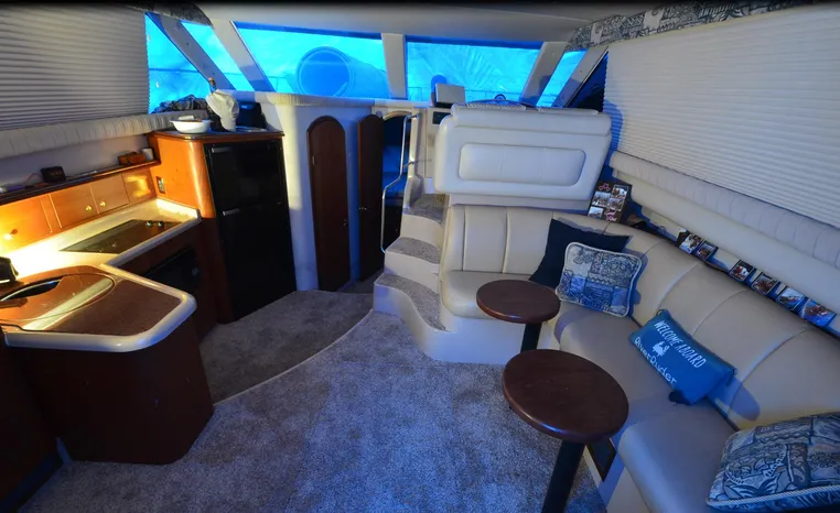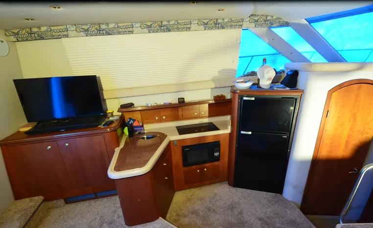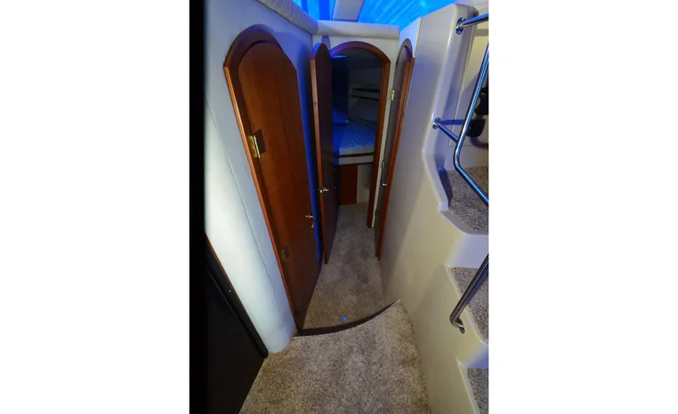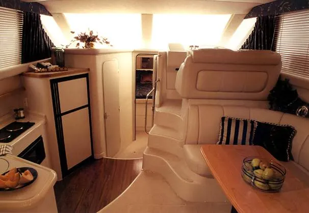 The Cruisers 3585 Flybridge maintains the classic lines of the earlier 3580 but offers a redesigned interior with distinctive features. The 3585 features a 'GalleyUp' design which creates a spacious, comfortable living space typical of larger boats. The salon offers a wrap-around, convertible dinette - double berth and a TV - entertainment center. The roomy galley, located a step down from the salon, includes a large refrigerator and freezer, a double burner electric stove, microwave oven, plenty of counter and cabinet space, plus parquet flooring. The 3585 provides a queen-sized forward island berth along with a second cabin located beneath the lower helm; this cabin boasts two twin beds that convert to a king-size. Plus, the stand-up head includes a separate shower for additional cruising convenience. In the cockpit, an optional wraparound L-seat accommodates extra passengers, while the helm seat and companion seating up top offer more room. All levels are accessed by molded steps.