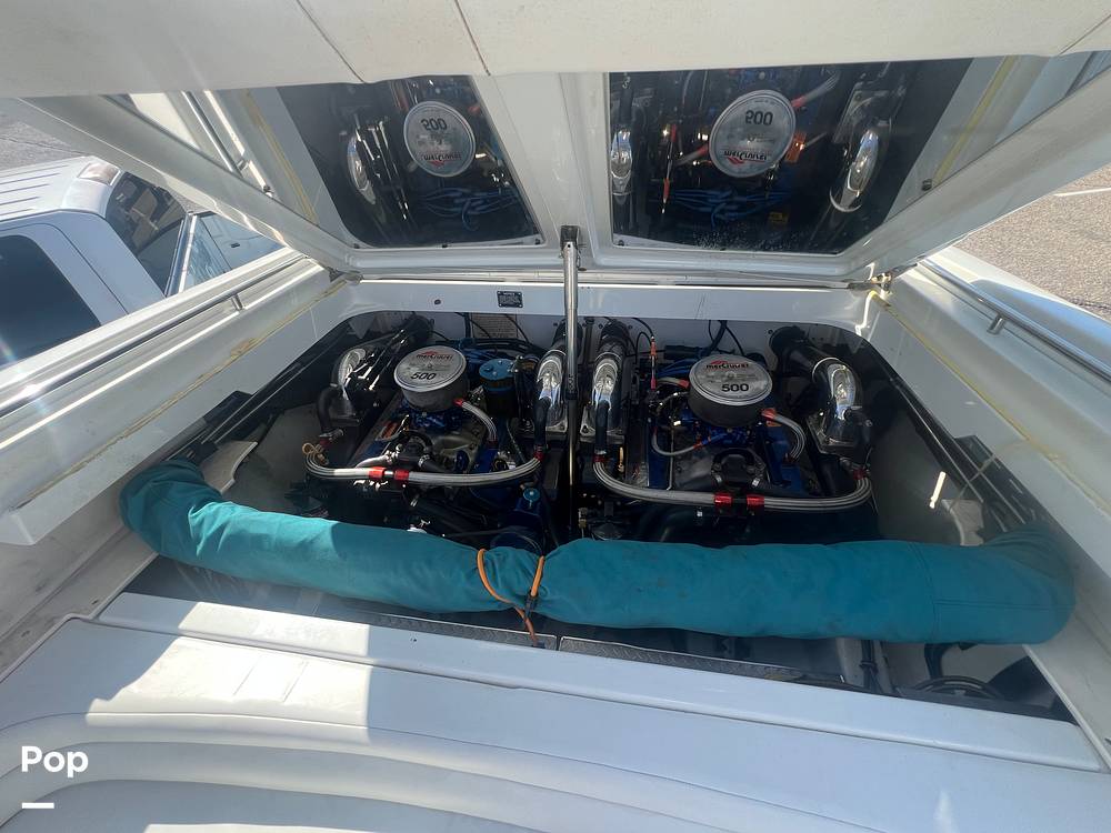 Powered by twin Mercruisers 500, which are paired with Bravo One Stern Drives. She will get up and go. The Port has 292 hours, and the Starboard has 701 hours.