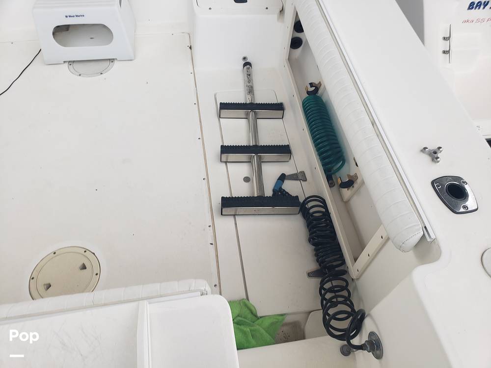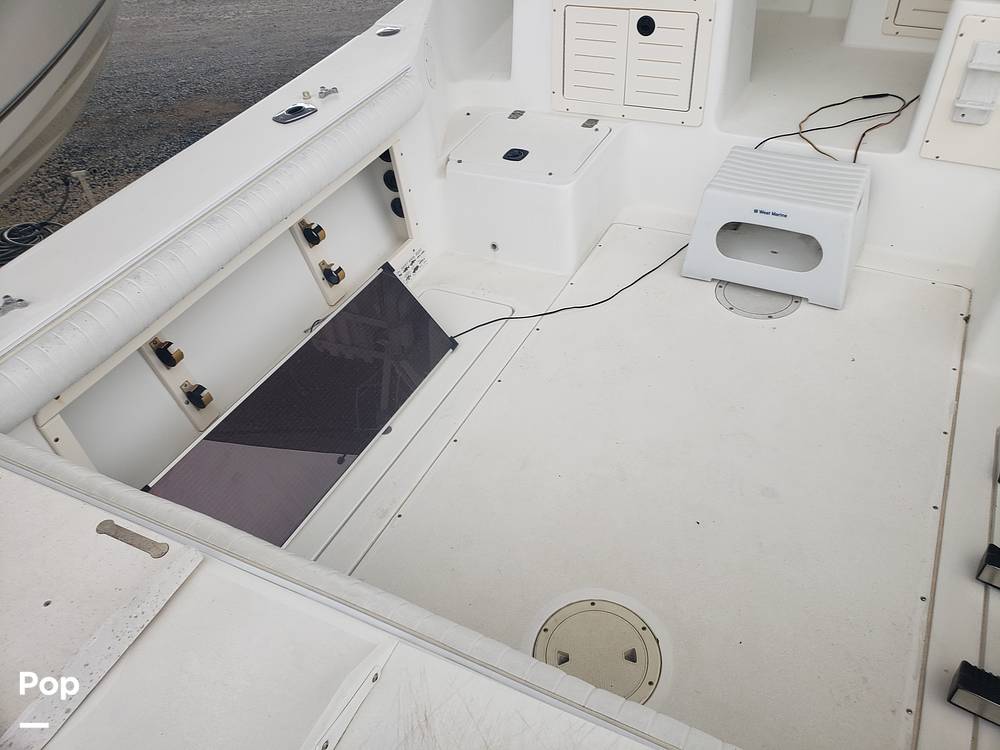 Entering from the aft transom door, you'll walk into a large cockpit with a fresh-water shower head, coaming bolsters, under-gunwale rod storage, a transom live well, rigging trays, fish boxes, raw water washdown, tackle storage, and access to the bilge.