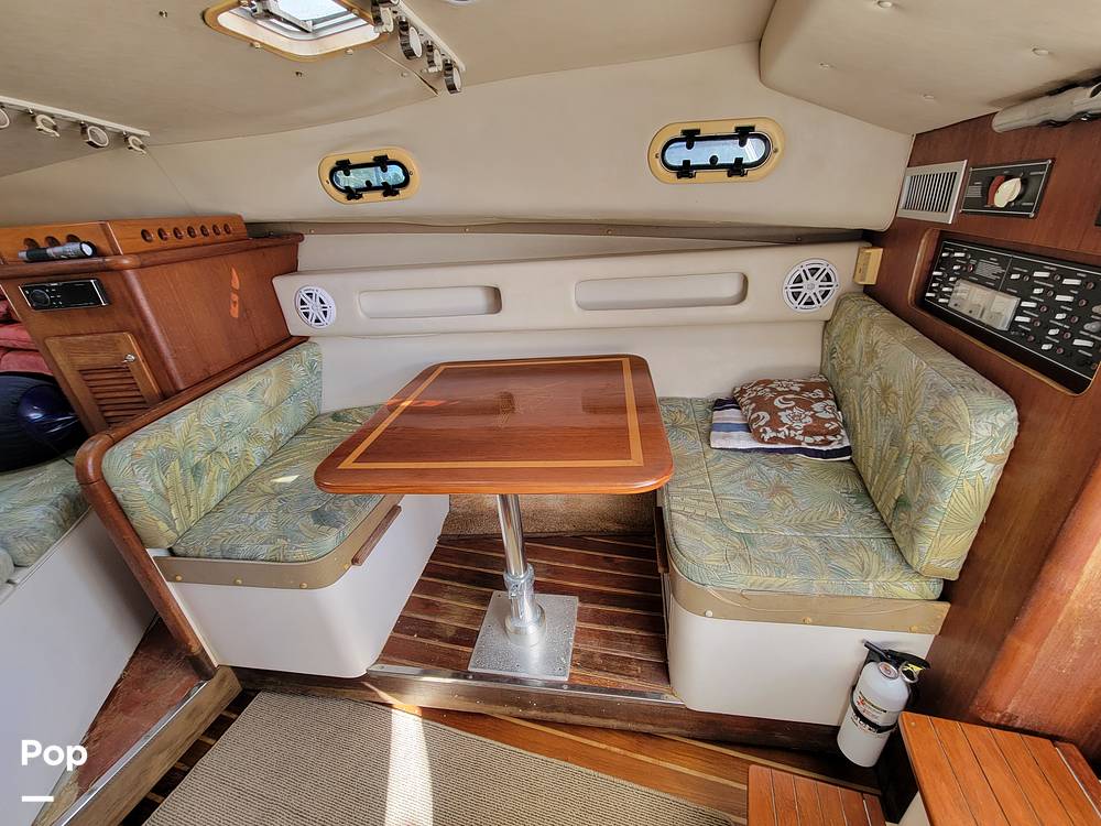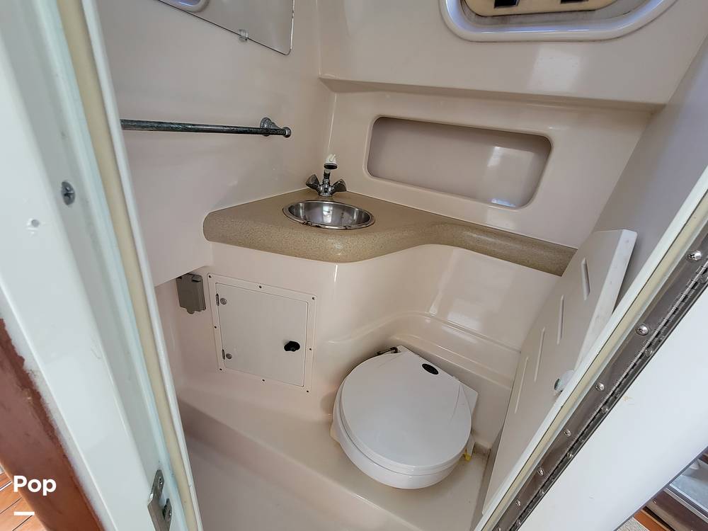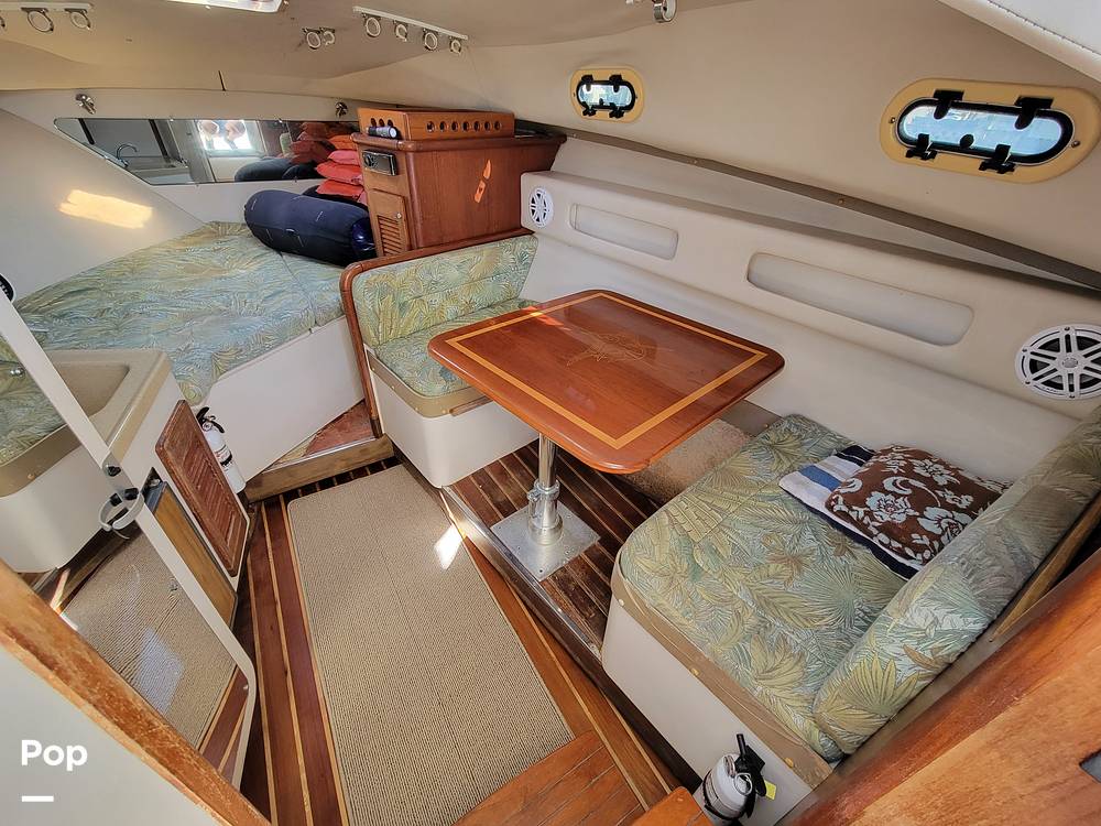 The cabin is cozy for overnight stays. There is a forward berth, and the table drops down to make a bed. There is a galley equipped with a microwave, sink, refrigerator, and stove top. You can keep cool dockside with the recently replaced 7000 btu air conditioner.