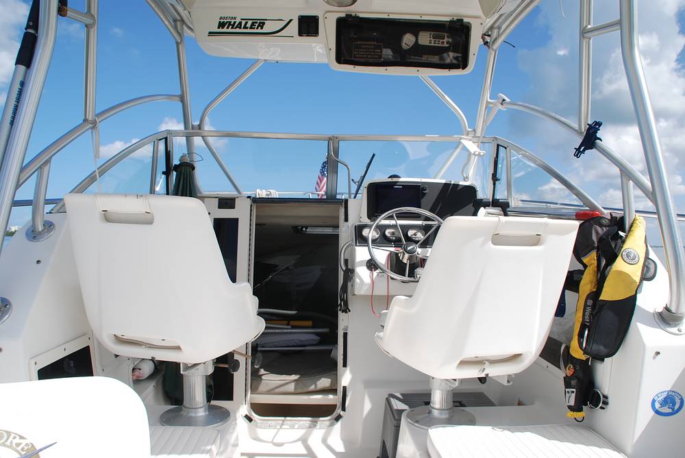 A great layout and lots of features including a comfortable cabin with V-berth and lots of storage for rods and gear. Large fiberglass hard-top, roomy cockpit with coaming bolsters and storage, adjustable helm and companion seats with cushions. port and starboard stern seats with cushion and a drop-down cushioned transom seat as well.