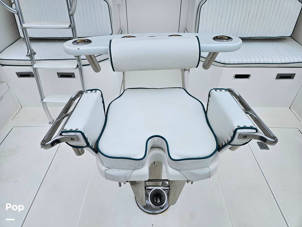 The flybridge offers excellent visibility with well-organized helm controls and comfortable seating for captain and crew, while the expansive cockpit is all business, featuring large fish boxes, a bait prep center, tackle storage, and plenty of room for fighting big game.