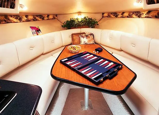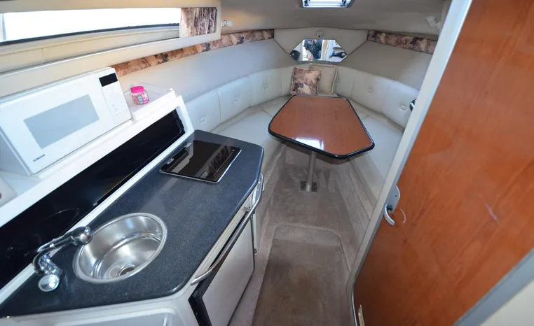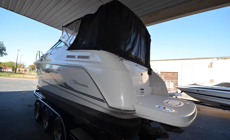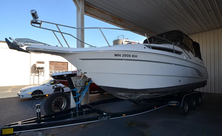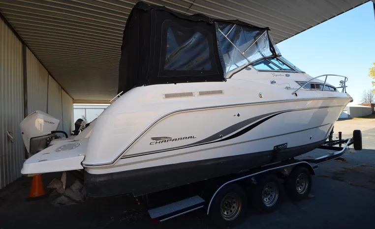 27' 2000 Chaparral 270 Signature, twin 190 HP, Mercruiser, engine hours TBD, raw water cooled, Alpha drive units, Marine Air, reverse cycle A/C unit, Galley down with under counter Norcold refrigerator, single burner stove, large sink, Vee Berth table converts to berth sleeps two, mid cabin double berth sleeps two, bimini with full enclosure camper top, extended swim platform, boarding ladder and triple axle bunk trailer.