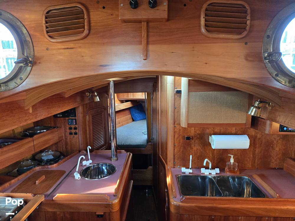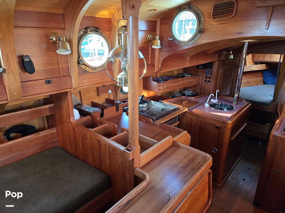 Below deck, the layout is designed for comfortable cruising, featuring two double berths and ample space for extended time aboard. Her thoughtful interior complements the vessel's traditional aesthetic, creating an inviting environment after a day under sail. The generous waterline length of nearly 32 feet contributes to steady passage-making and confident offshore capability.
