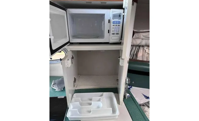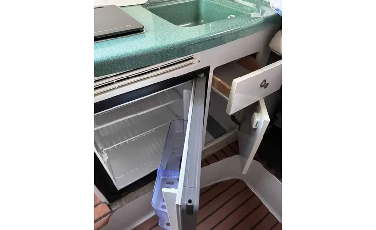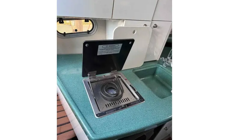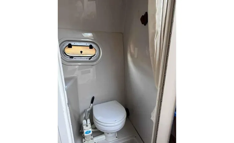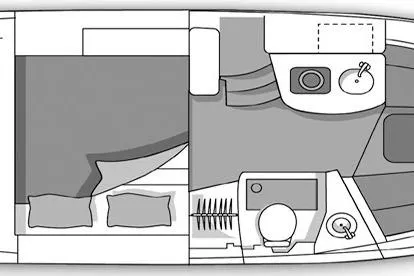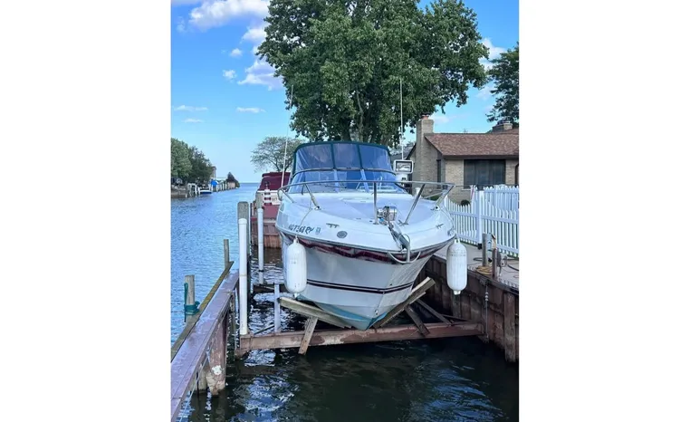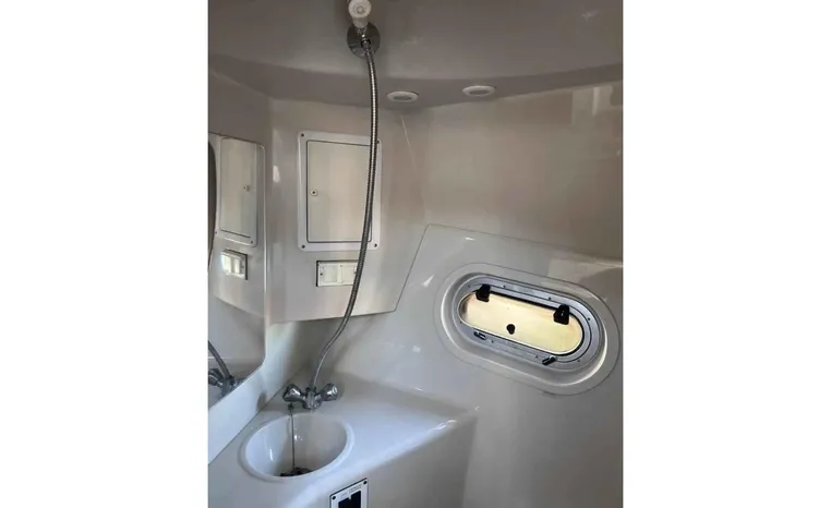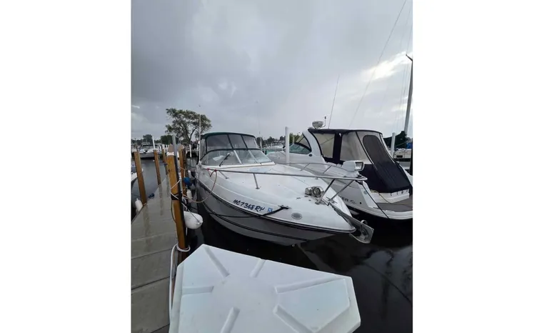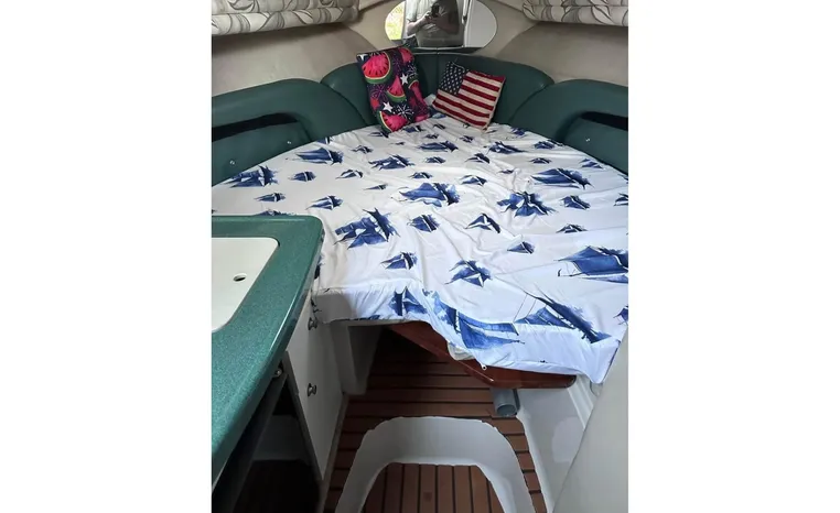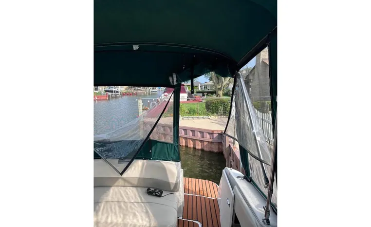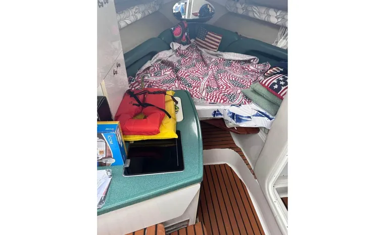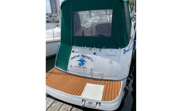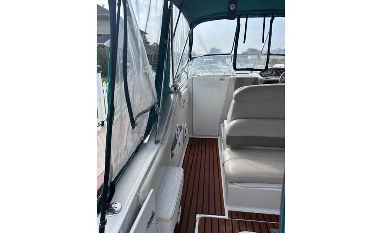 Feature-rich family cruiser with extended swim platform, forward-facing arch packs big-boat comfort in relatively compact hull. Well-appointed mid-cabin interior with fully equipped galley, enclosed head with shower sleeps four. Note Corian galley counter, premium hardware and fabrics. Roomy cockpit with dual helm seat, U-shaped lounge seats six. Transom storage locker is a nice touch. Sporty helm has attractive burl-wood dash, tilt wheel, cup holders, chart flat.