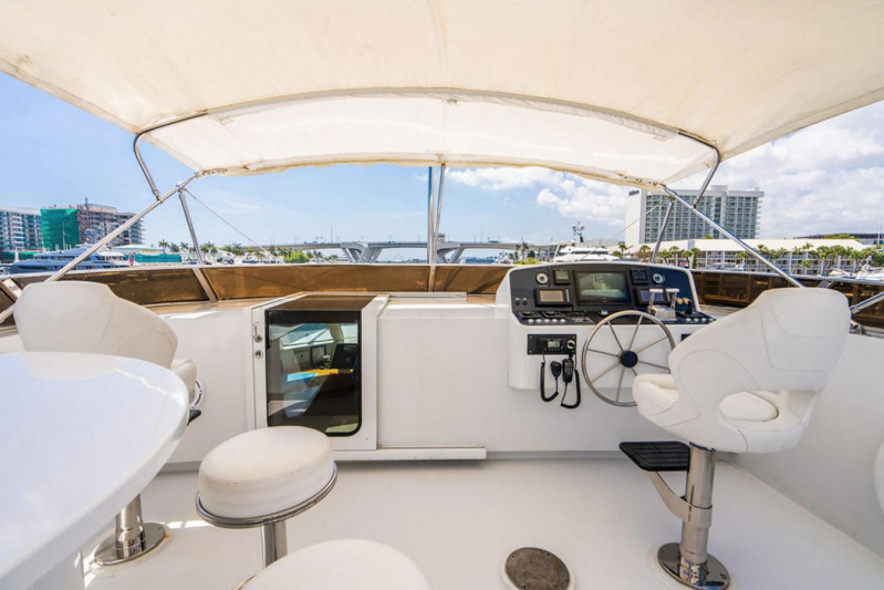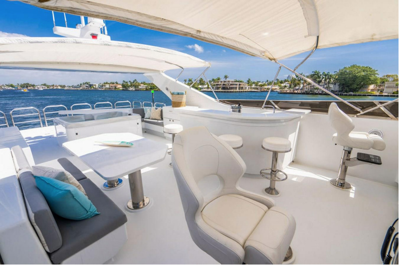 • Flybridge: Bar, dining area, starboard-side helm, tender storage