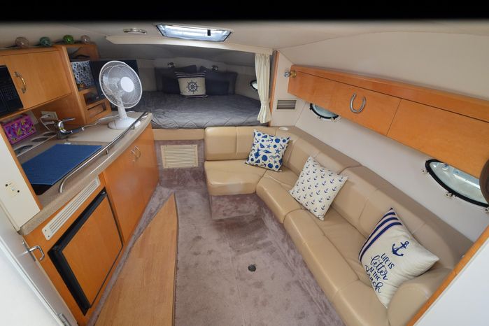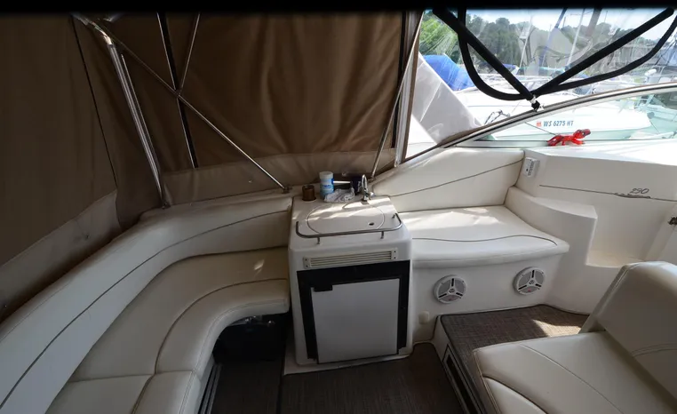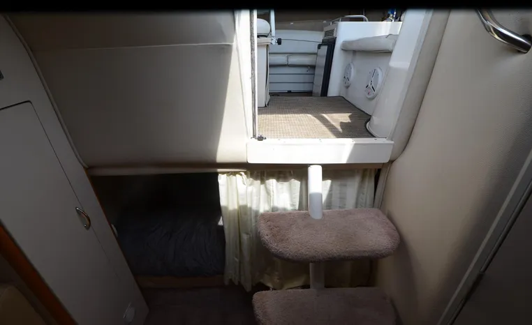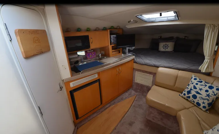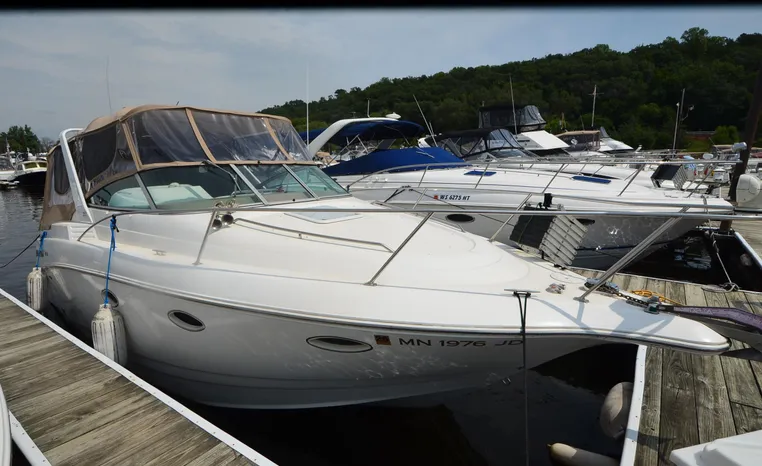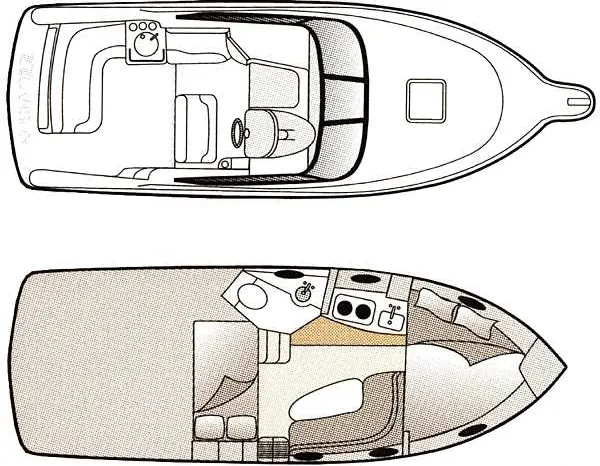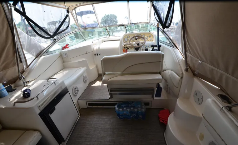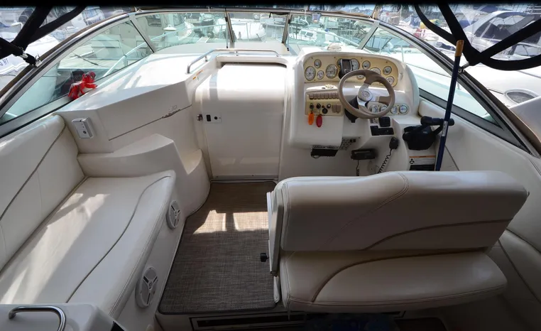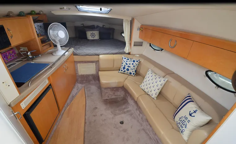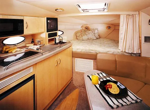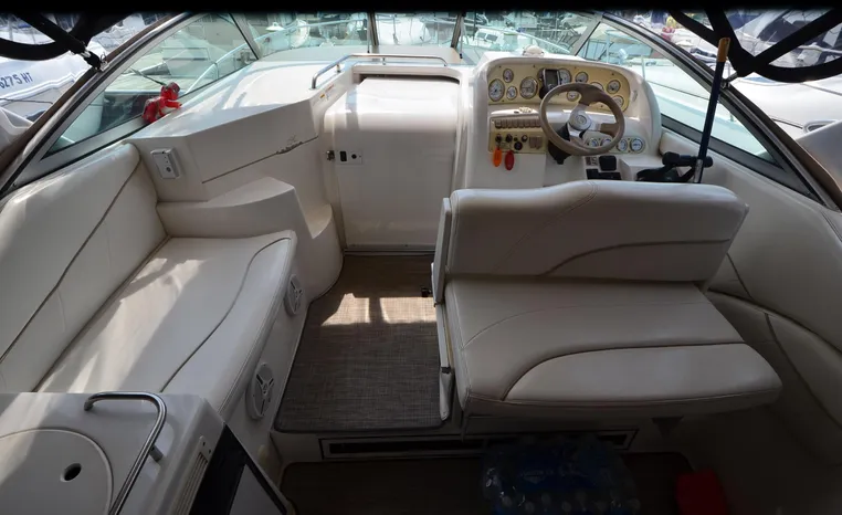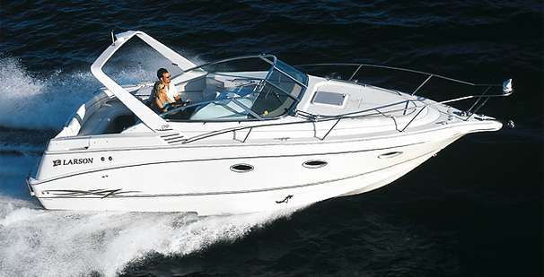 The Larson Cabrio 290 Mid-Cabin has a full 10-foot beam so there's room in the cockpit for all the captain's friends. The cockpit features lift-out L-seats aft, a full wet bar with space for a refrigerator, and a double-wide helm seat that stores a carry-on cooler. The Cabrio 290 has optional twin-sterndrive power and all the performance benefits of the Duo-Delta Conic notched hull. Belowdecks, the Cabrio 290 offers plenty of space, comfort, and luxury. An updated cabin layout features a suspended vinyl headliner, polished maple cabinetry, and butter-soft Ultra-Leather upholstery. The galley includes a two-burner range and an easy-to-clean wood-flooring insert. A wrap-around dinette seat and an open bulkhead provide access to the mid-cabin berth, while the oversized V-berth accommodates a couple in comfort for a weekend or a week-long cruise.