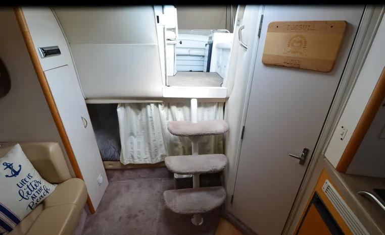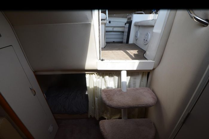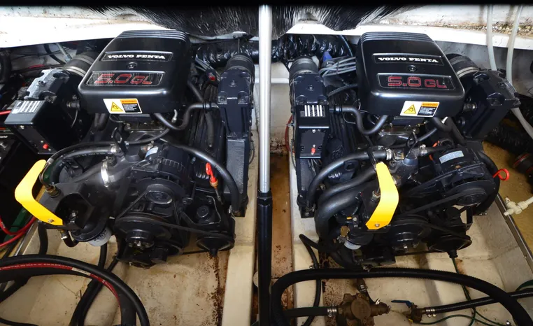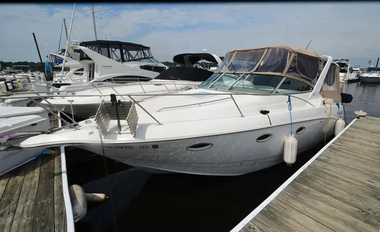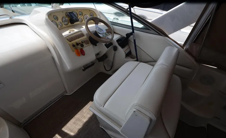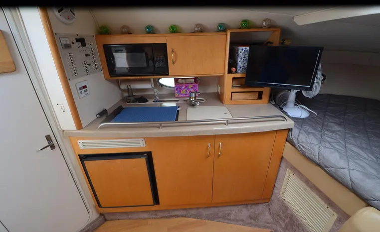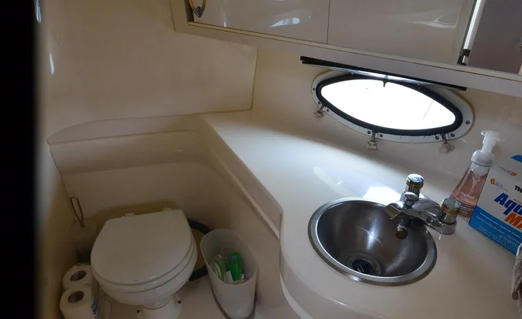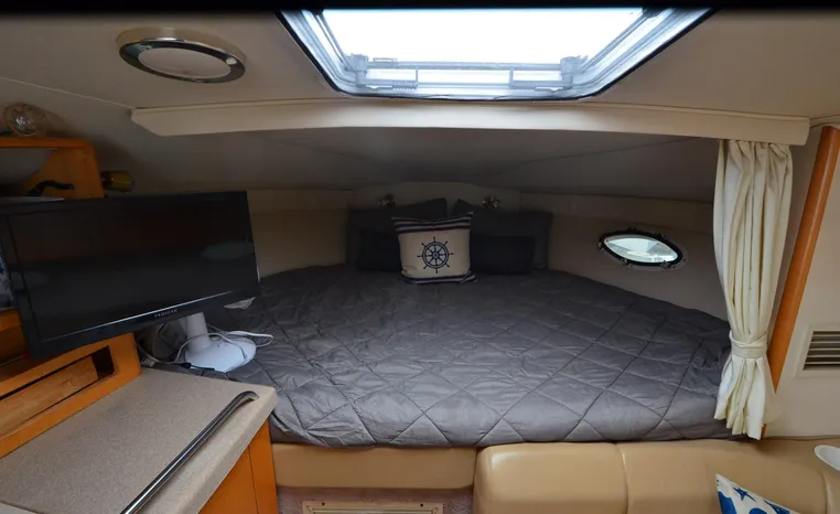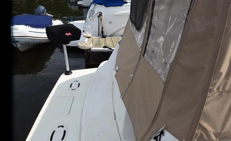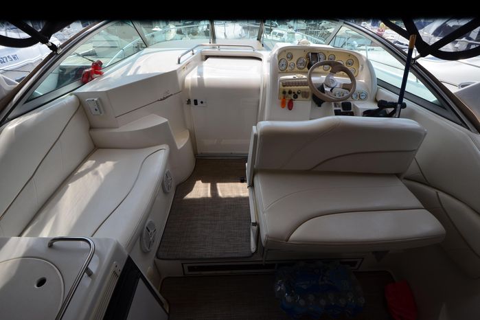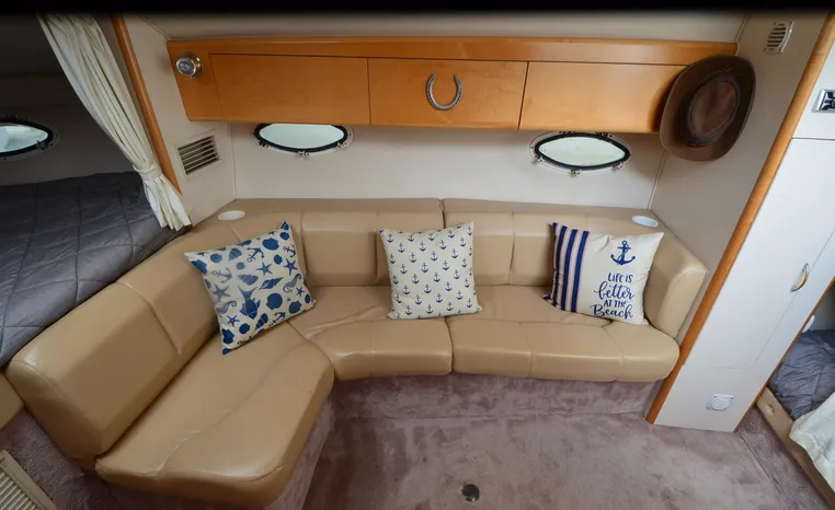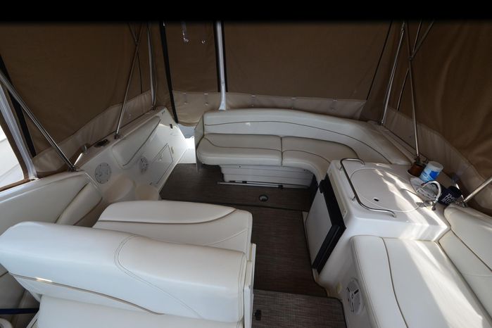 The Larson Cabrio 290 Mid-Cabin has a full 10-foot beam so there's room in the cockpit for all the captain's friends. The cockpit features lift-out L-seats aft, a full wet bar with space for a refrigerator, and a double-wide helm seat that stores a carry-on cooler. The Cabrio 290 has optional twin-sterndrive power and all the performance benefits of the Duo-Delta Conic notched hull. Belowdecks, the Cabrio 290 offers plenty of space, comfort, and luxury. An updated cabin layout features a suspended vinyl headliner, polished maple cabinetry, and butter-soft Ultra-Leather upholstery. The galley includes a two-burner range and an easy-to-clean wood-flooring insert. A wrap-around dinette seat and an open bulkhead provide access to the mid-cabin berth, while the oversized V-berth accommodates a couple in comfort for a weekend or a week-long cruise.