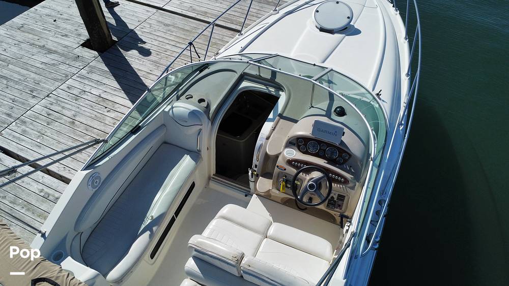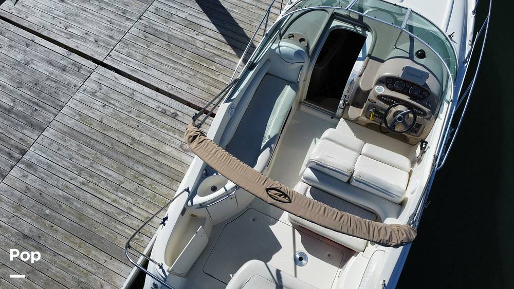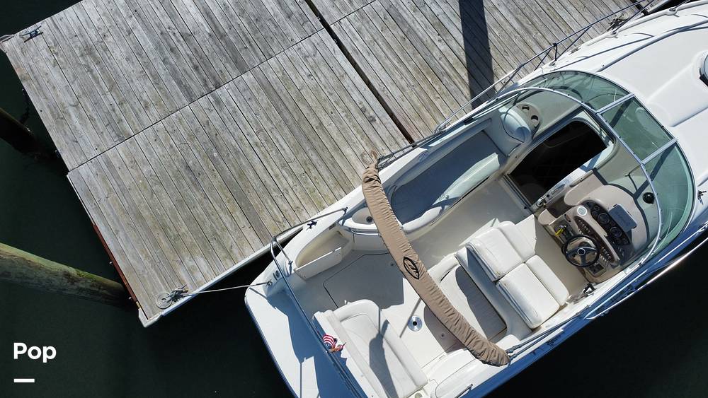 It's been well taken care of, with the engine and water systems winterized professionally each year and stored dry and wrapped off-season. Bimini top, lots of storage, and a stereo system for added convenience. The cockpit is really versatile with convertible seating, and the boat has a sleek, modern look.