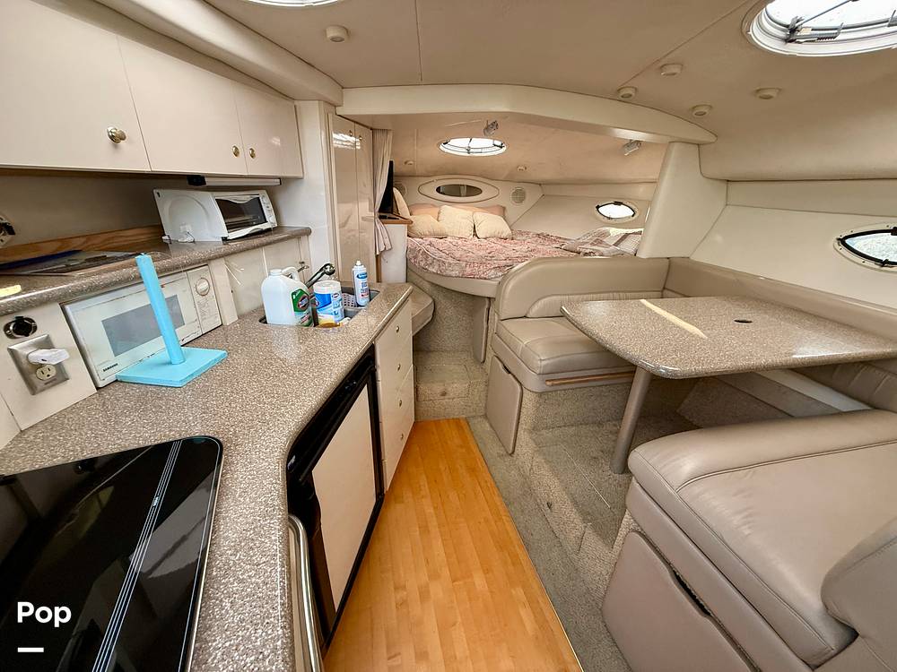 The spacious cockpit is perfect for entertaining with wraparound seating, a table, and an extended swim platform. Below deck, the cabin features a forward berth, mid-berth, and convertible dinette to sleep 5 to 6, plus a full galley with refrigerator, stove, microwave, and sink.