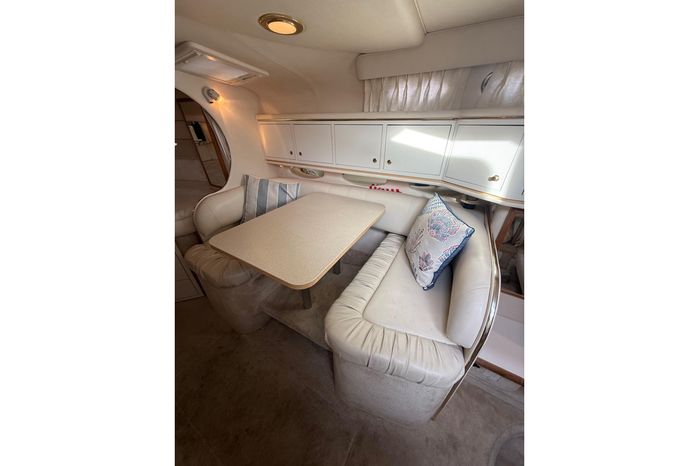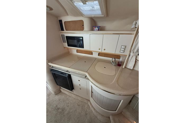 With her striking profile and comfortable interior, the Sea Ray 310 Sundancer was designed for upscale cruisers willing to pay top dollar for a quality mid-size express. This is a well-crafted boat, better finished than previous Sea Ray models and incorporating high-grade hardware, appliances, and furnishings. When the 310 Sundancer was introduced in 1998, she came with an unusual floor-plan that required those using the forward kidney-shaped berth to climb over the circular dinette seat. Sea Ray dumped that plan in 1999, replacing it with a more conventional layout with an angled double berth forward and a conventional dinette with facing seats. In both configurations, a roomy mid-cabin offers true seclusion thanks to a real door instead of a curtain. The Sundancer's large cockpit has everything for relaxing and entertaining including a triple helm seat (with a flip-up seat for the driver), U-shaped aft seating, and a refreshment center with wet bar and cooler. For engine access, the entire bridge-deck raises electrically at the push of a button.