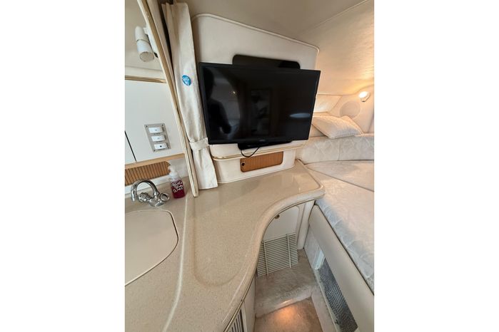 Freshwater / Great Lakes boat since new this vessel features Twin MerCruiser 350-Magnum 300-hp Gas Engine's with MAG MPI 350 V-Drive Engines (Note: Starboard Engine Replaced 2025 with only 35 hours). Notable features include but are not limited to the following: Air-Conditioning & Heat, Head (Vacuflush) w/Vanity/Sink/Shower, Windlass Anchor, Garmin Color Chartplotter, Raytheoon VHF Radio, Premium Stereo system with CD Player, Cockpit Speakers, Cockpit Wet Bar w/Sink, New Aquadek on swim platform, Canvas Package (Camper Top w/Strata-Glass & Screens), Snap-in Snap-out Cockpit Carpeting, and MUCH more!
