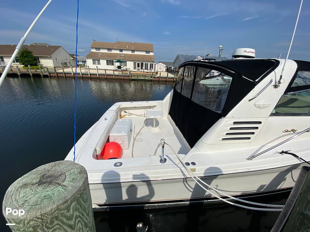 When you step on this 2000 Sea Ray 370, the first thing you notice is how spacious this boat is. You enter the boat off the big swim platform through a transom gate that gives way to a cockpit deck that is huge. And, there's a big live well and fish box built into the sole. The cockpit has a wet bar, lots of storage, and A refrigerator.