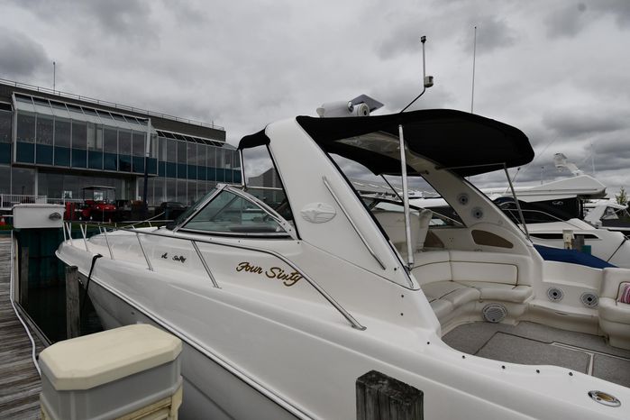 Freshwater / Great Lakes boat since new this vessel features Twin Caterpillar 3208 435-hp Diesel Engine's. Notable features include but are not limited to the following: Air-Conditioning & Heat (2-Units), (2) Heads (Vacuflush) w/Vanity/Sink/Stall-Shower, Cherry Cabinetry, Windlass Anchor w/Forward Pedal-Controls (Note Forward Freshwater Washdown), Hydraulic Swim-Platform, Canvas Package (Forward Convertible-Top w/Forward / Side-Windows / Aft Convertible-Top w/3-Piece Slant-Back Rear), Cockpit Wet Bar w/Sink, Westerbeke 8.0kw Generator, NEW 2025 Electronics Package (Garmin GPSMAP 1643 MFD w/GPS/Chartplotter, Garmin GPSMAP 943 XSV w/Autopilot Interface, Garmin VHF 115 Marine Radio, Starlink w/Seaview-Mount (Professional Install), Premium Fusion Sound System w/(2) Sub-Woofers/AMP/Wired Remote-Control (Note Bluetooth) - Extensive JL-Audio Speakers Throughout Cockpit / Swim-Platform - Note Interface NEMA2000 w/Garmin MFD, and MUCH more!