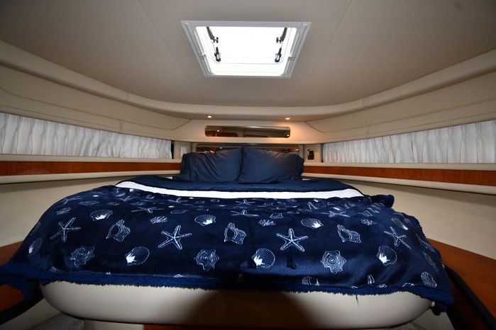 Freshwater / Great Lakes boat since new this vessel features Twin Caterpillar 3208 435-hp Diesel Engine's. Notable features include but are not limited to the following: Air-Conditioning & Heat (2-Units), (2) Heads (Vacuflush) w/Vanity/Sink/Stall-Shower, Cherry Cabinetry, Windlass Anchor w/Forward Pedal-Controls (Note Forward Freshwater Washdown), Hydraulic Swim-Platform, Canvas Package (Forward Convertible-Top w/Forward / Side-Windows / Aft Convertible-Top w/3-Piece Slant-Back Rear), Cockpit Wet Bar w/Sink, Westerbeke 8.0kw Generator, NEW 2025 Electronics Package (Garmin GPSMAP 1643 MFD w/GPS/Chartplotter, Garmin GPSMAP 943 XSV w/Autopilot Interface, Garmin VHF 115 Marine Radio, Starlink w/Seaview-Mount (Professional Install), Premium Fusion Sound System w/(2) Sub-Woofers/AMP/Wired Remote-Control (Note Bluetooth) - Extensive JL-Audio Speakers Throughout Cockpit / Swim-Platform - Note Interface NEMA2000 w/Garmin MFD, and MUCH more!