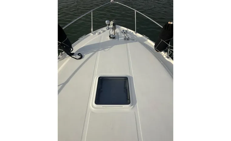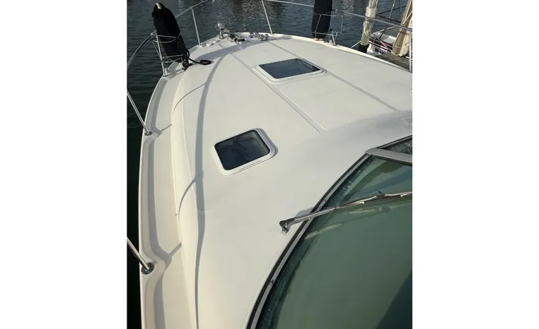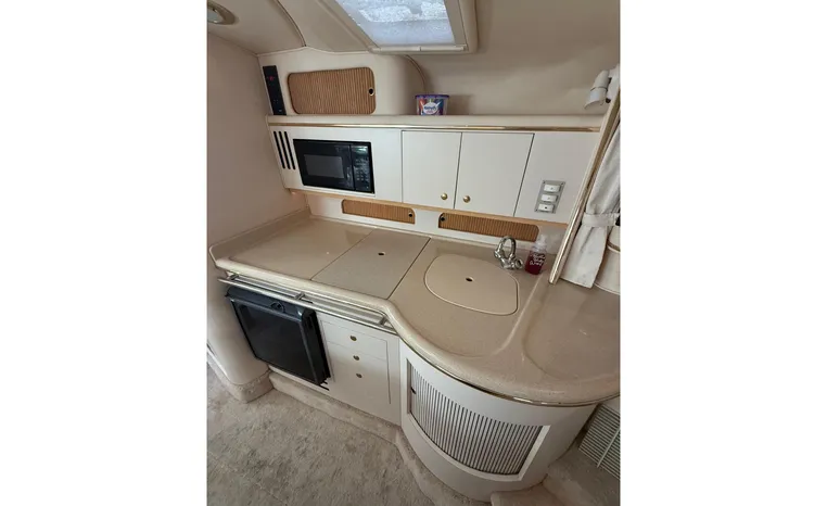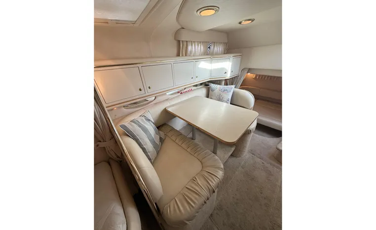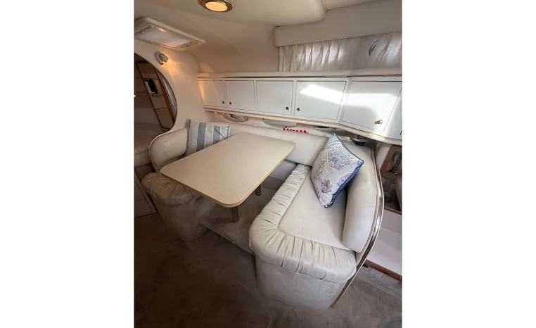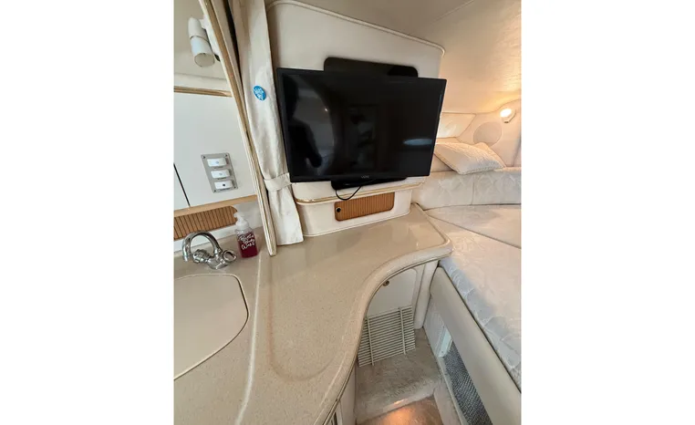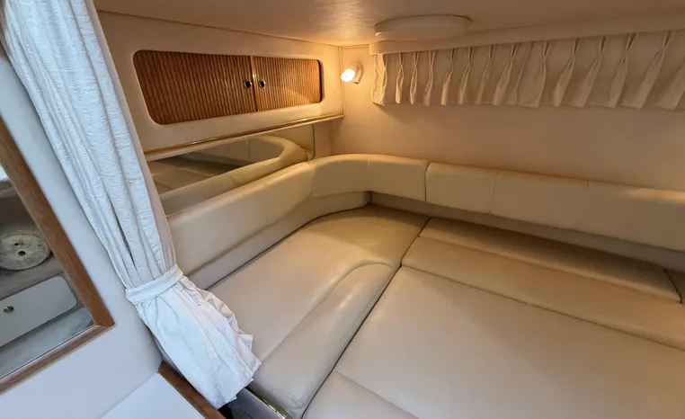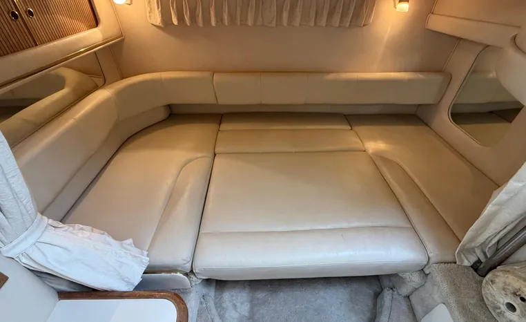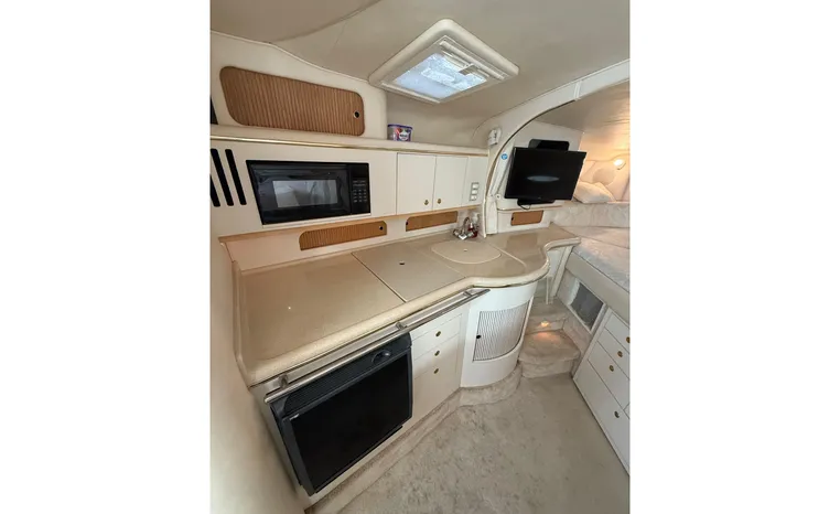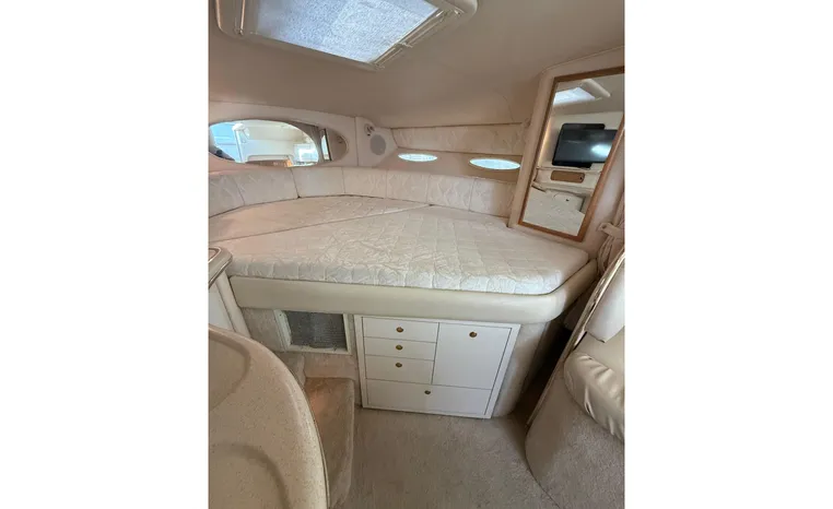 With her striking profile and comfortable interior, the Sea Ray 310 Sundancer was designed for upscale cruisers willing to pay top dollar for a quality mid-size express. This is a well-crafted boat, better finished than previous Sea Ray models and incorporating high-grade hardware, appliances, and furnishings. When the 310 Sundancer was introduced in 1998, she came with an unusual floor-plan that required those using the forward kidney-shaped berth to climb over the circular dinette seat. Sea Ray dumped that plan in 1999, replacing it with a more conventional layout with an angled double berth forward and a conventional dinette with facing seats. In both configurations, a roomy mid-cabin offers true seclusion thanks to a real door instead of a curtain. The Sundancer's large cockpit has everything for relaxing and entertaining including a triple helm seat (with a flip-up seat for the driver), U-shaped aft seating, and a refreshment center with wet bar and cooler. For engine access, the entire bridge-deck raises electrically at the push of a button.