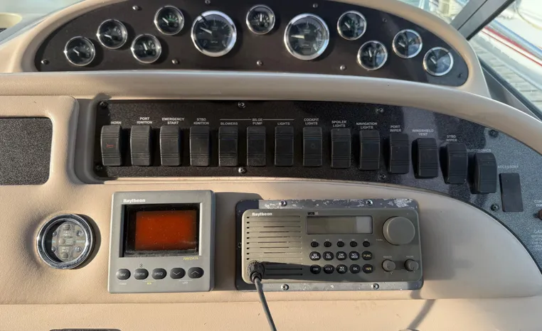 Freshwater / Great Lakes boat since new this vessel features Twin MerCruiser 350-Magnum 300-hp Gas Engine's with MAG MPI 350 V-Drive Engines (Note: Starboard Engine Replaced 2025 with only 35 hours). Notable features include but are not limited to the following: Air-Conditioning & Heat, Head (Vacuflush) w/Vanity/Sink/Shower, Windlass Anchor, Garmin Color Chartplotter, Raytheoon VHF Radio, Premium Stereo system with CD Player, Cockpit Speakers, Cockpit Wet Bar w/Sink, New Aquadek on swim platform, Canvas Package (Camper Top w/Strata-Glass & Screens), Snap-in Snap-out Cockpit Carpeting, and MUCH more!