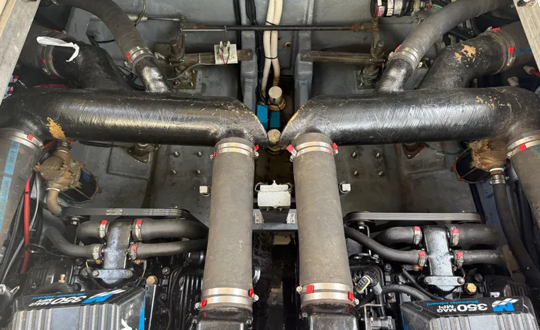 Freshwater / Great Lakes boat since new this vessel features Twin MerCruiser 350-Magnum 300-hp Gas Engine's with MAG MPI 350 V-Drive Engines (Note: Starboard Engine Replaced 2025 with only 35 hours). Notable features include but are not limited to the following: Air-Conditioning & Heat, Head (Vacuflush) w/Vanity/Sink/Shower, Windlass Anchor, Garmin Color Chartplotter, Raytheoon VHF Radio, Premium Stereo system with CD Player, Cockpit Speakers, Cockpit Wet Bar w/Sink, New Aquadek on swim platform, Canvas Package (Camper Top w/Strata-Glass & Screens), Snap-in Snap-out Cockpit Carpeting, and MUCH more!