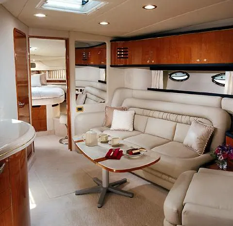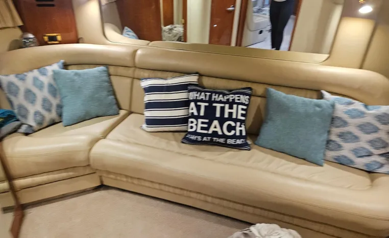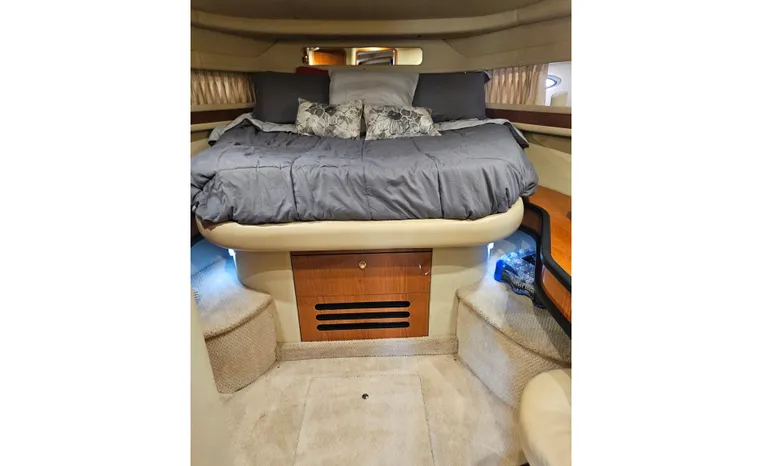 Extended cruising not only requires a boat that was built for the long haul, but a boat that was built to make the trip completely enjoyable. That's why Sea Ray created the 460 Sundancer. The cockpit of the 460 Sundancer creates a relaxing atmosphere with a custom slide and swivel helm seat with a flip-up thigh-rise for the captain, and a Euro-style companion bench seat. The ergonomically designed control station not only puts the latest Raytheon electronics and Sea Ray's backlit instrumentation close at hand, it also reflects Sea Ray's dedication to style with a tan dash gelcoat and high-gloss burl wood panels. There's even a digital LCD systems monitor for engine diagnostics and pump monitoring. Passengers have plenty of room to enjoy the sun with spacious U-shaped cockpit seating (with an electrically actuated retractable sunpad), and a movable cockpit table. Carefully planned details like a snap-in carpet liner, self-bailing fiberglass cockpit liner, a wetbar in the side panel to port, and a Clarion AM-FM digital cassette stereo with six-disc CD changer, subwoofer, four speakers, and a cockpit remote control make the 460 Sundancer ideal for quality entertaining. The oversized swim platform is easily accessed through a transom door. When it comes to storage, the 460 Sundancer has all the space needed for long excursions, including aft wall fender storage which keeps docking equipment neatly tucked away. Additional gear can also be stowed in the seats and side storage areas in the cockpit. The cabin of the Sea Ray 460 Sundancer has a comfortable salon with an electric sleeper sofa, movable dining table, and an entertainment center featuring a TV - VCR - radio combination, and Clarion AM-FM digital cassette and single CD stereo system with six-disc CD changer, amplifier, and four speakers. A washer and dryer combination has been included in the mid stateroom for at-home convenience. Complementing the decor of the room are granite-look countertops, handcrafted wood trim, and lush marine-grade carpeting. The galley comes complete with everything necessary for long trips, including a recessed three-burner cooktop, refrigerator and freezer, microwave oven, even a Spacemaker coffee maker. Owners and their guests can retreat to their own private quarters on the Sea Ray 460 Sundancer, including a forward stateroom with a full-size bed, cedar-lined hanging lockers, vanity, and sliding privacy door with full-length mirror. In the mid stateroom, a comfortable sofa converts to a double bed by simply flipping a switch. There are two private head areas featuring a VacuFlush head with shower, plus both staterooms have their own entertainment centers with TV - VCR - radio combinations. The optional engines are twin 430 horsepower Cummins V-drives. The 460 Sundancer has durable underwater gear including a unique bonding system, manganese-bronze rudders and struts, seacocks on all fittings, and dripless shaft logs with an extra seal carrier kit.
