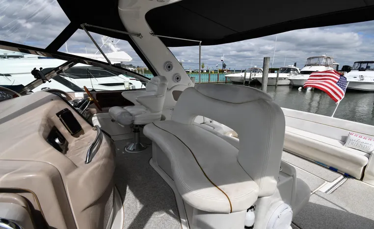 Freshwater / Great Lakes boat since new this vessel features Twin Caterpillar 3208 435-hp Diesel Engine's. Notable features include but are not limited to the following: Air-Conditioning & Heat (2-Units), (2) Heads (Vacuflush) w/Vanity/Sink/Stall-Shower, Cherry Cabinetry, Windlass Anchor w/Forward Pedal-Controls (Note Forward Freshwater Washdown), Hydraulic Swim-Platform, Canvas Package (Forward Convertible-Top w/Forward / Side-Windows / Aft Convertible-Top w/3-Piece Slant-Back Rear), Cockpit Wet Bar w/Sink, Westerbeke 8.0kw Generator, NEW 2025 Electronics Package (Garmin GPSMAP 1643 MFD w/GPS/Chartplotter, Garmin GPSMAP 943 XSV w/Autopilot Interface, Garmin VHF 115 Marine Radio, Starlink w/Seaview-Mount (Professional Install), Premium Fusion Sound System w/(2) Sub-Woofers/AMP/Wired Remote-Control (Note Bluetooth) - Extensive JL-Audio Speakers Throughout Cockpit / Swim-Platform - Note Interface NEMA2000 w/Garmin MFD, and MUCH more!