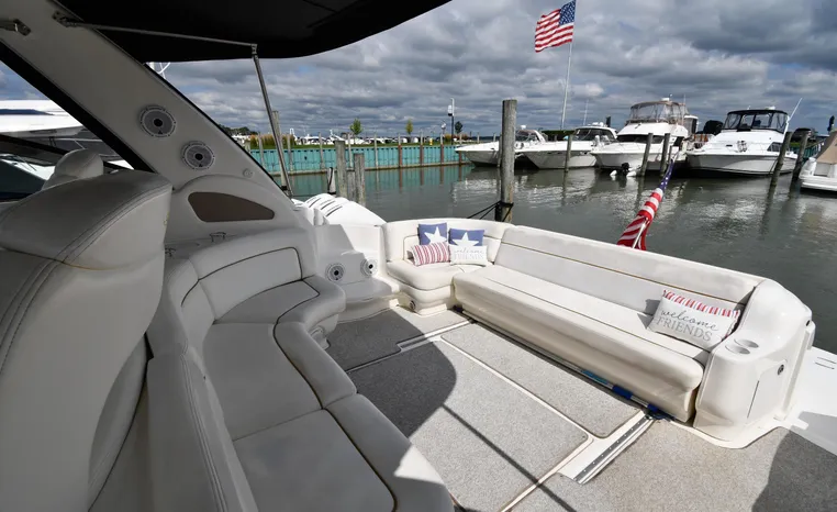 Freshwater / Great Lakes boat since new this vessel features Twin Caterpillar 3208 435-hp Diesel Engine's. Notable features include but are not limited to the following: Air-Conditioning & Heat (2-Units), (2) Heads (Vacuflush) w/Vanity/Sink/Stall-Shower, Cherry Cabinetry, Windlass Anchor w/Forward Pedal-Controls (Note Forward Freshwater Washdown), Hydraulic Swim-Platform, Canvas Package (Forward Convertible-Top w/Forward / Side-Windows / Aft Convertible-Top w/3-Piece Slant-Back Rear), Cockpit Wet Bar w/Sink, Westerbeke 8.0kw Generator, NEW 2025 Electronics Package (Garmin GPSMAP 1643 MFD w/GPS/Chartplotter, Garmin GPSMAP 943 XSV w/Autopilot Interface, Garmin VHF 115 Marine Radio, Starlink w/Seaview-Mount (Professional Install), Premium Fusion Sound System w/(2) Sub-Woofers/AMP/Wired Remote-Control (Note Bluetooth) - Extensive JL-Audio Speakers Throughout Cockpit / Swim-Platform - Note Interface NEMA2000 w/Garmin MFD, and MUCH more!