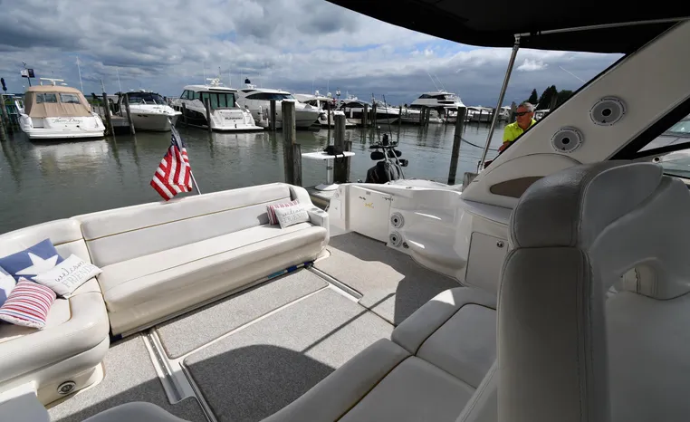 Freshwater / Great Lakes boat since new this vessel features Twin Caterpillar 3208 435-hp Diesel Engine's. Notable features include but are not limited to the following: Air-Conditioning & Heat (2-Units), (2) Heads (Vacuflush) w/Vanity/Sink/Stall-Shower, Cherry Cabinetry, Windlass Anchor w/Forward Pedal-Controls (Note Forward Freshwater Washdown), Hydraulic Swim-Platform, Canvas Package (Forward Convertible-Top w/Forward / Side-Windows / Aft Convertible-Top w/3-Piece Slant-Back Rear), Cockpit Wet Bar w/Sink, Westerbeke 8.0kw Generator, NEW 2025 Electronics Package (Garmin GPSMAP 1643 MFD w/GPS/Chartplotter, Garmin GPSMAP 943 XSV w/Autopilot Interface, Garmin VHF 115 Marine Radio, Starlink w/Seaview-Mount (Professional Install), Premium Fusion Sound System w/(2) Sub-Woofers/AMP/Wired Remote-Control (Note Bluetooth) - Extensive JL-Audio Speakers Throughout Cockpit / Swim-Platform - Note Interface NEMA2000 w/Garmin MFD, and MUCH more!