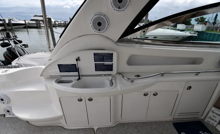 Freshwater / Great Lakes boat since new this vessel features Twin Caterpillar 3208 435-hp Diesel Engine's. Notable features include but are not limited to the following: Air-Conditioning & Heat (2-Units), (2) Heads (Vacuflush) w/Vanity/Sink/Stall-Shower, Cherry Cabinetry, Windlass Anchor w/Forward Pedal-Controls (Note Forward Freshwater Washdown), Hydraulic Swim-Platform, Canvas Package (Forward Convertible-Top w/Forward / Side-Windows / Aft Convertible-Top w/3-Piece Slant-Back Rear), Cockpit Wet Bar w/Sink, Westerbeke 8.0kw Generator, NEW 2025 Electronics Package (Garmin GPSMAP 1643 MFD w/GPS/Chartplotter, Garmin GPSMAP 943 XSV w/Autopilot Interface, Garmin VHF 115 Marine Radio, Starlink w/Seaview-Mount (Professional Install), Premium Fusion Sound System w/(2) Sub-Woofers/AMP/Wired Remote-Control (Note Bluetooth) - Extensive JL-Audio Speakers Throughout Cockpit / Swim-Platform - Note Interface NEMA2000 w/Garmin MFD, and MUCH more!