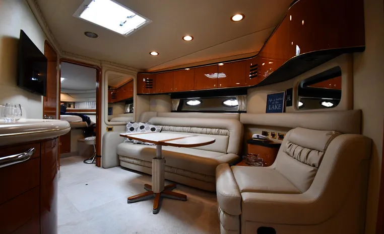 Freshwater / Great Lakes boat since new this vessel features Twin Caterpillar 3208 435-hp Diesel Engine's. Notable features include but are not limited to the following: Air-Conditioning & Heat (2-Units), (2) Heads (Vacuflush) w/Vanity/Sink/Stall-Shower, Cherry Cabinetry, Windlass Anchor w/Forward Pedal-Controls (Note Forward Freshwater Washdown), Hydraulic Swim-Platform, Canvas Package (Forward Convertible-Top w/Forward / Side-Windows / Aft Convertible-Top w/3-Piece Slant-Back Rear), Cockpit Wet Bar w/Sink, Westerbeke 8.0kw Generator, NEW 2025 Electronics Package (Garmin GPSMAP 1643 MFD w/GPS/Chartplotter, Garmin GPSMAP 943 XSV w/Autopilot Interface, Garmin VHF 115 Marine Radio, Starlink w/Seaview-Mount (Professional Install), Premium Fusion Sound System w/(2) Sub-Woofers/AMP/Wired Remote-Control (Note Bluetooth) - Extensive JL-Audio Speakers Throughout Cockpit / Swim-Platform - Note Interface NEMA2000 w/Garmin MFD, and MUCH more!