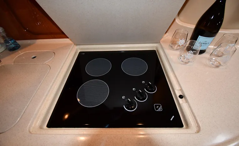 One of the largest domestic express yachts available when she was introduced in 1999, the Sea Ray 460 Sundancer is an impressive blend of American sportboat styling, luxury-class accommodations, and state-of-the-art construction. While the styl- ing was perhaps more conservative than most European express yachts of her era, a wide beam and an expansive two-stateroom, two-head floorplan provide the 460 with cabin dimensions that European imports—with their relatively narrow beams—could only envy. Sea Ray interiors have always been among the best in the business, and the accommodations of the 460 are impressive in every respect. The mid-stateroom, complete with an enclosed head and standard washer/dryer, offers complete privacy behind sliding pocket doors. (Note that the settees in both the salon and mid-stateroom convert to double berth at the touch of a button.) In the cockpit, the facing aft settees convert electrically into a huge sun pad. A gas-assist hatch provides easy access to the engine room. An extended swim platform was standard.