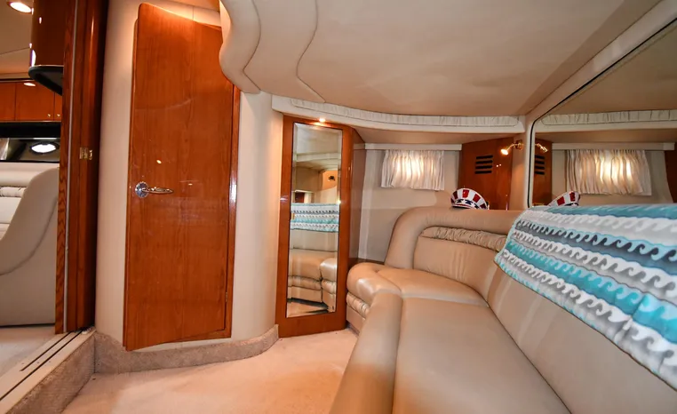 Freshwater / Great Lakes boat since new this vessel features Twin Caterpillar 3208 435-hp Diesel Engine's. Notable features include but are not limited to the following: Air-Conditioning & Heat (2-Units), (2) Heads (Vacuflush) w/Vanity/Sink/Stall-Shower, Cherry Cabinetry, Windlass Anchor w/Forward Pedal-Controls (Note Forward Freshwater Washdown), Hydraulic Swim-Platform, Canvas Package (Forward Convertible-Top w/Forward / Side-Windows / Aft Convertible-Top w/3-Piece Slant-Back Rear), Cockpit Wet Bar w/Sink, Westerbeke 8.0kw Generator, NEW 2025 Electronics Package (Garmin GPSMAP 1643 MFD w/GPS/Chartplotter, Garmin GPSMAP 943 XSV w/Autopilot Interface, Garmin VHF 115 Marine Radio, Starlink w/Seaview-Mount (Professional Install), Premium Fusion Sound System w/(2) Sub-Woofers/AMP/Wired Remote-Control (Note Bluetooth) - Extensive JL-Audio Speakers Throughout Cockpit / Swim-Platform - Note Interface NEMA2000 w/Garmin MFD, and MUCH more!